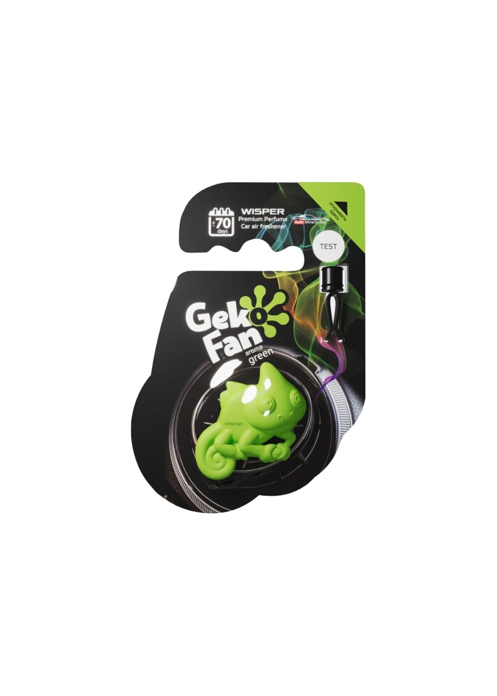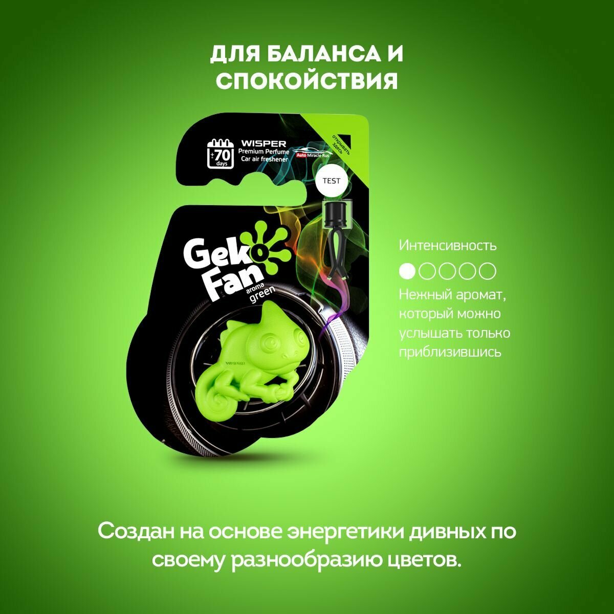 **Ароматизатор Wisper Gekofan Green** источает бодрящий и эффектный аромат, который заряд энергией, что особенно актуально во время длительных поездок. Средство позволяет нейтрализовать и минимизировать воздействие неприятных запахов. Установка производится на дефлектор. Оболочка выполнена из приятного на ощупь эко-полимера, за счет чего ее можно крутить в руках, сжимать, гнуть.