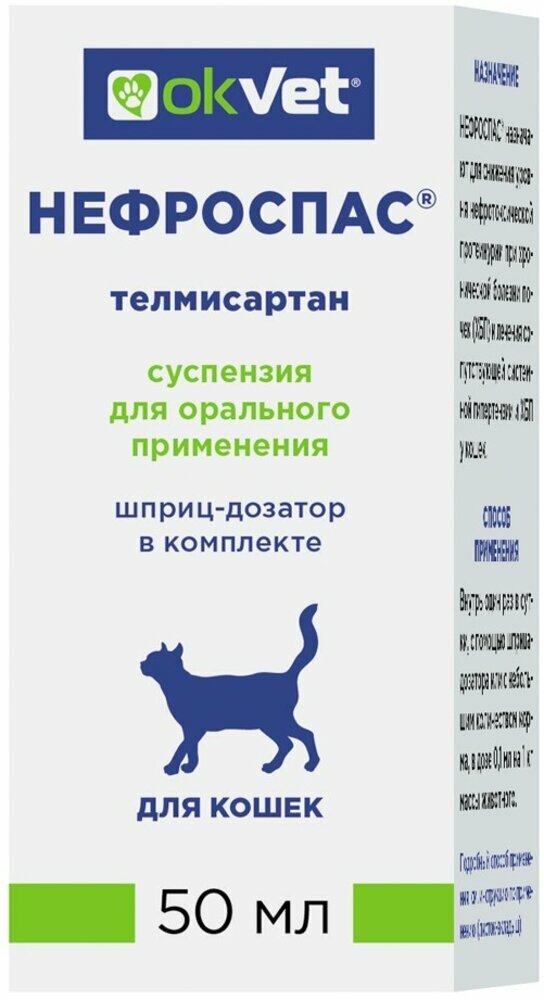 НЕФРОСПАС® назначают для снижения уровня нефротоксической протеинурии при хронической болезни почек (ХБП) и лечения сопутствующей системной гипертензии и ХБП у кошек.