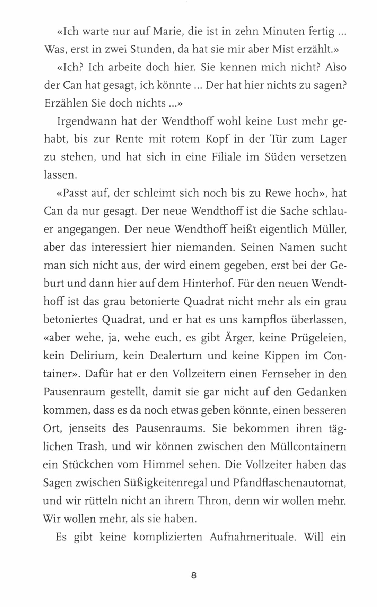 Der Hinterhof des Pennymarktes ist mehr als ein Hinterhof fur Lena, auch genannt «Entenarsch». Denn hier bekommt man seinen Namen, ob man will oder nicht. Entenarsch hat ihren von Jo, der vor einigen Wochen einfach verschwunden ist. Jo, der mit Marie zusammen war. Und an deren Trennung Entenarsch nicht ganz unschuldig ist. Entenarsch, Marie und Can beschlie?en, Jo zu suchen – aus den unterschiedlichsten Motiven. Ihre Fahrt durch brullend hei?e Sommertage fuhrt sie immer weiter in den Suden, bis zu einem riesigen Musikfestival. Und wahrend Jo wie vom Erdboden verschluckt scheint, versammeln sich um die drei Suchenden immer mehr gute Bekannte vom Hinterhof. Am Ende wird Entenarsch am Meer auf Jo treffen. Und wird nie wieder Entenarsch genannt werden.