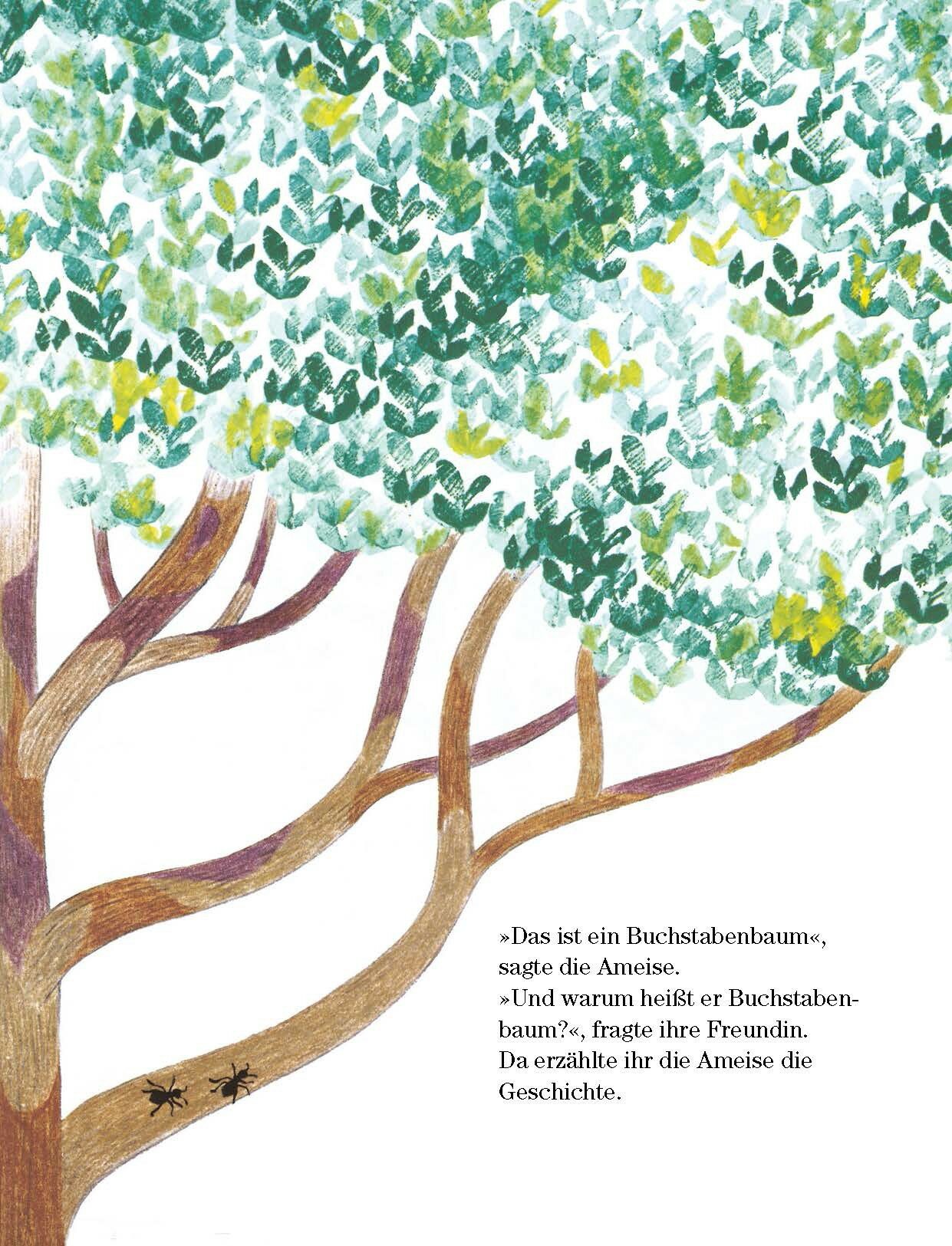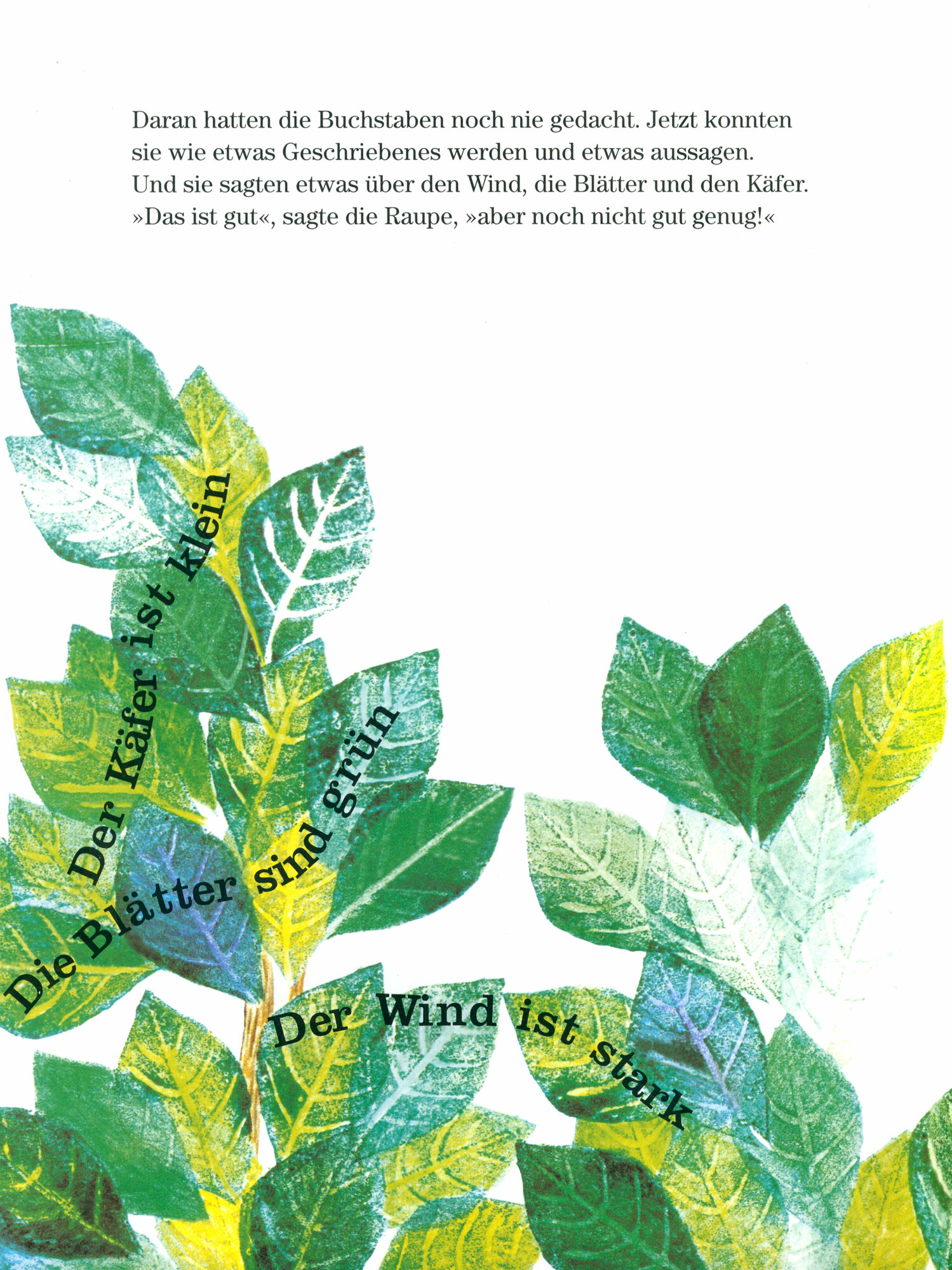 Die Worter leben im Buchstabenbaum in standiger Angst vor dem Sturm, der sie auseinander rei?en konnte. Wie gut, dass die Raupe ihnen zeigt, wie sie Satze bilden konnen: »Warum tut ihr euch nicht zusammen und seid endlich etwas von Bedeutung?«