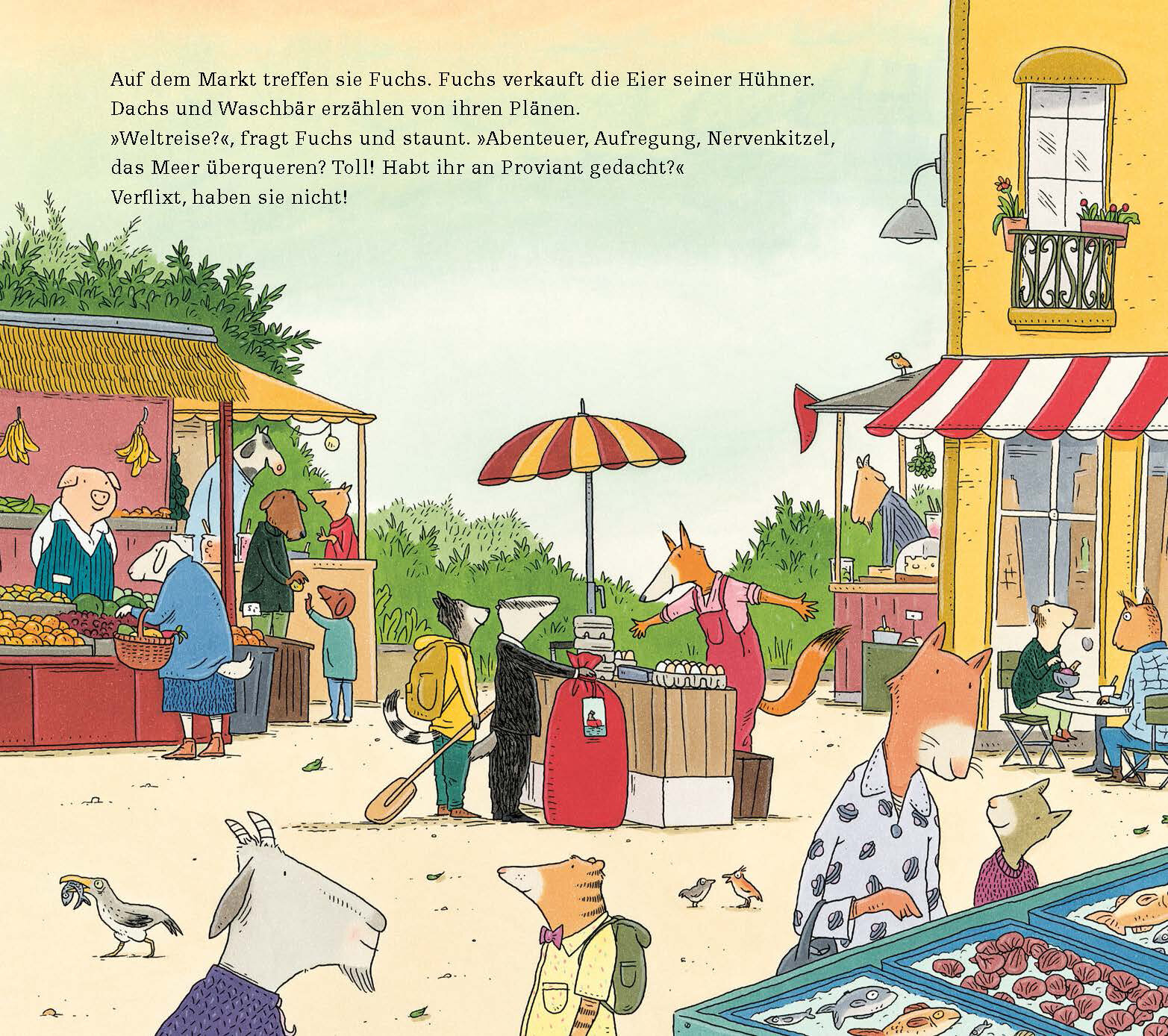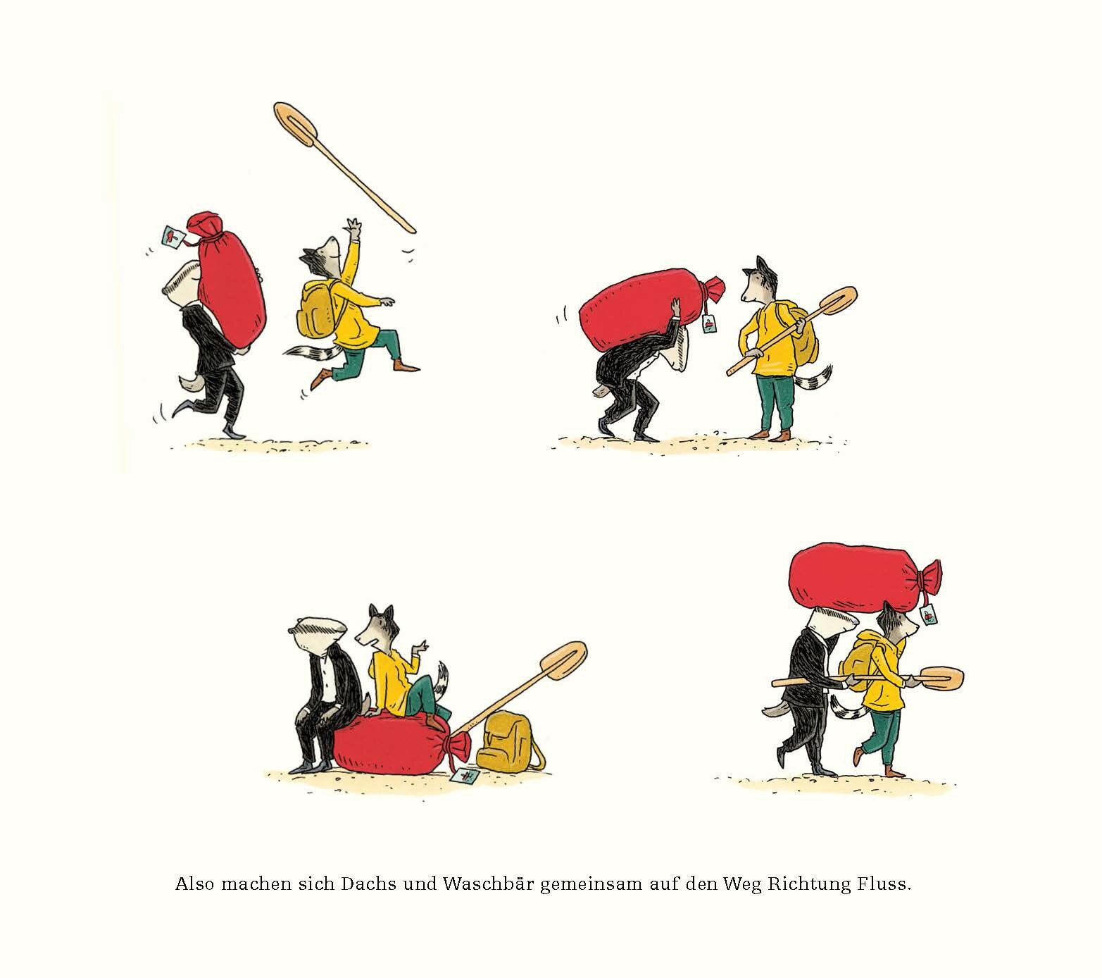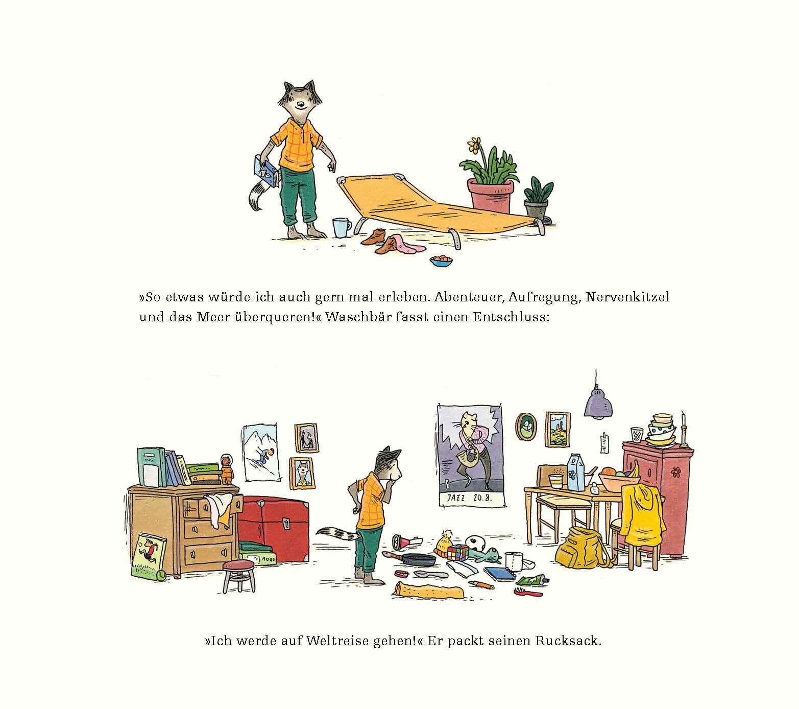 Waschbar will ans Meer. Dafur leiht er sich bei Dachs ein Boot aus. Aber weil man solch eine Reise niemals allein machen sollte, kommt Dachs gerne mit. Unterwegs gabeln sie Fuchs auf, der die Eier furs Omelett einpackt, Bar und Krahe. Sie tosen durch Stromschnellen, sammeln Steinpilze, su?e Brombeeren, verjagen die Bienen und genie?en einen wunderbar faulen Tag – bis das Heimweh sie packt.