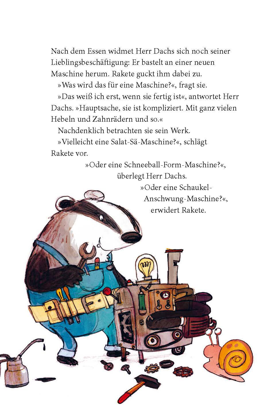 Eines Morgens steht ein Bagger im Bau von Herrn Dachs, dem hemdsarmeligen Erfinder, und seiner besten Freundin Rakete. Ein Natur-Erlebnispark soll hier entstehen und sie mussen raus! Sofort!