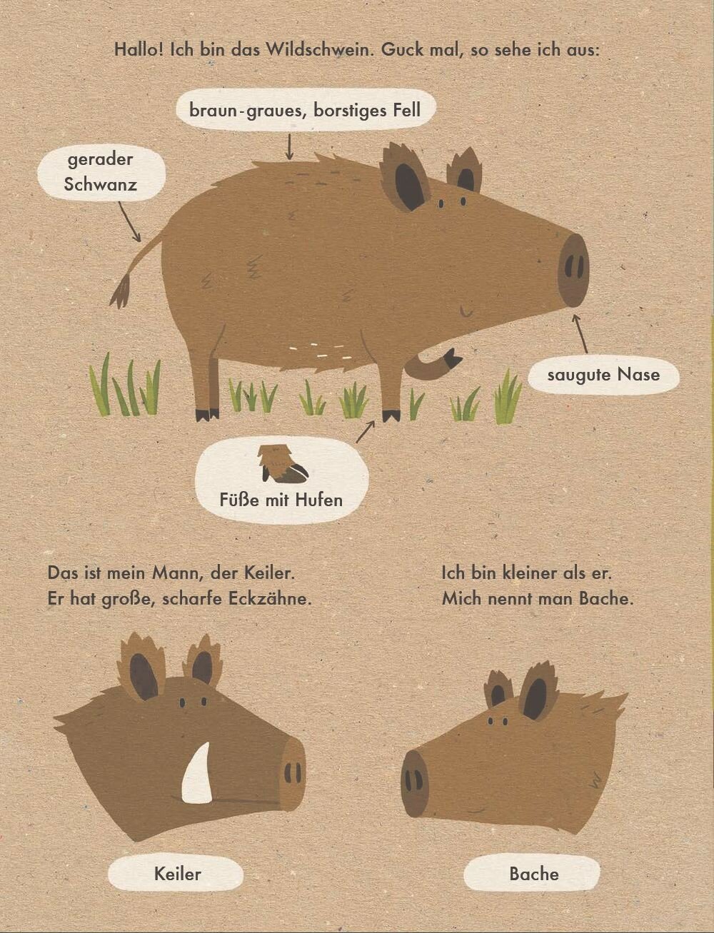 Wildschweine leben gern in Rotten und da geht es ganz schon turbulent zu: die Bache mochte sich in Ruhe suhlen, aber die kleinen Frischlinge dusen durch das Dickicht… Warmherzige Illustrationen und kurze Texte erklaren auf 7 Doppelseiten leicht verstandlich, welche Rolle die struppigen und grunzenden Schwergewichte fur den Wald spielen. Im Bewusstsein fur Umweltschutz und Nachhaltigkeit, mit Okofarben auf Recyclingpapier gedruckt: das ist unser 100% Naturbuch.