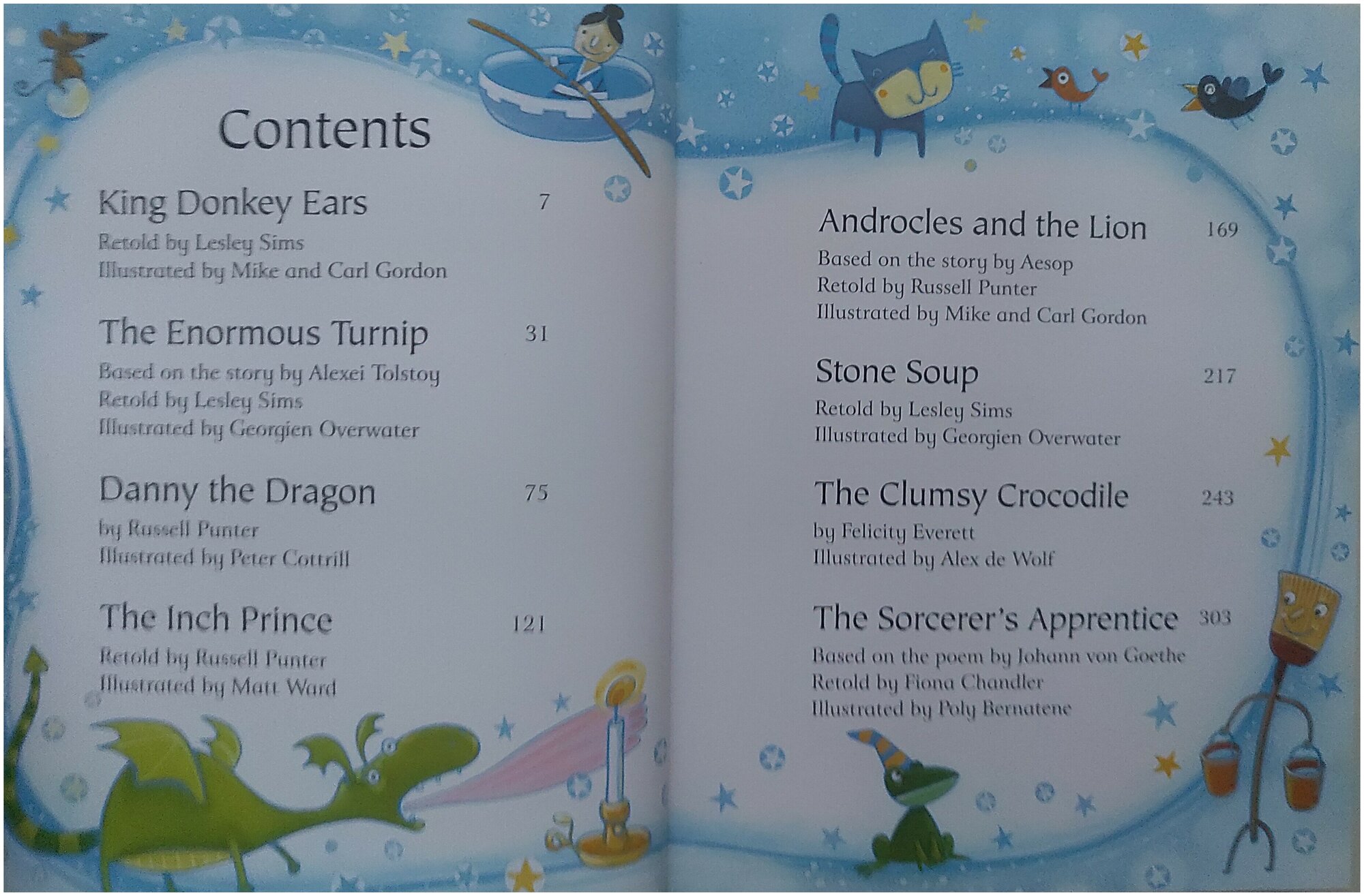 Eight delightful tales of heart-warming fun and adventure. Stories include “King Donkey Ears”, “The Enormous Turnip”, “Danny the Dragon”, “The Inch Prince”, “Androcles and the Lion”, “Stone Soup”, “The Clumsy Crocodile” and “The Sorcerer’s Apprentice”. Each story is brilliantly illustrated by artists from the Usborne Young Reading Programme.