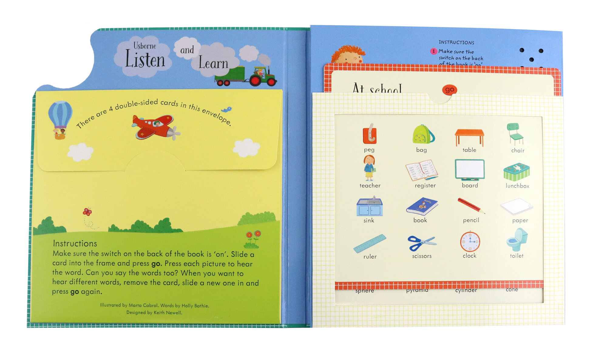 A fun and interactive way for children to listen to and learn 120 everyday words spoken by a native English speaker. Each of the four double-sided topic cards has sixteen words and pictures about letters, numbers and being at school. Slot the card into the book’s special frame and press the pictures to hear the words read aloud.