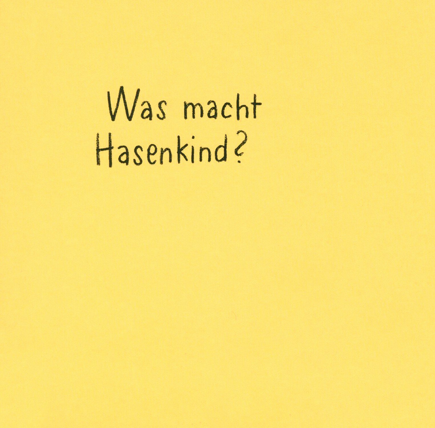 Hasenkind ist wieder da! Erst versteckt es sich hinter einer Decke, dann lugt es dahinter hervor: Kuckuck! Auch sonst mag Hasenkind alles, was kleine Kinder mogen: Schaukeln zum Beispiel und im Badewasser planschen. Oder mit seinem Puppchen „Hasenkind, flieg!“ spielen. Und zum Schluss streckt es allen gar die Zunge heraus, denn Hasenkind hat es faustdick hinter den langen Ohren…