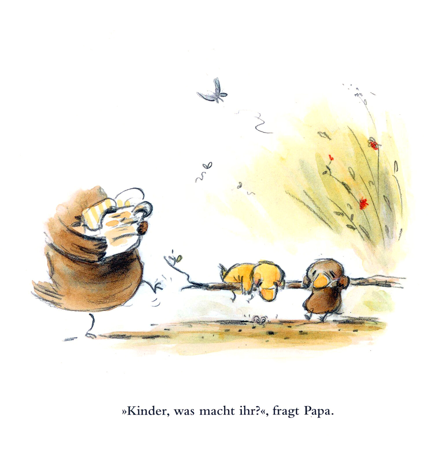 Spielt doch Fu?ball! Geht schaukeln! Macht ein Wettrennen!, ermuntert sie ihr Papa. Nichts gefallt! Selbst als er das Planschbecken fur sie aufpustet, ist ihnen erst das Wasser zu kalt, dann fehlen die Bademutzen. Aber da kommt Spatz und springt ins Wasser. »Der Letzte im Wasser ist ein Angsthase!«, ruft er. Und als dann auch noch ein Pupser zu horen ist, gibt es kein Halten mehr: Der Tag wird wunderbar! Ein Bilderbuch, das zeigt, wie gemeinsam zu spielen immer noch den gro?ten Spa? bereitet.