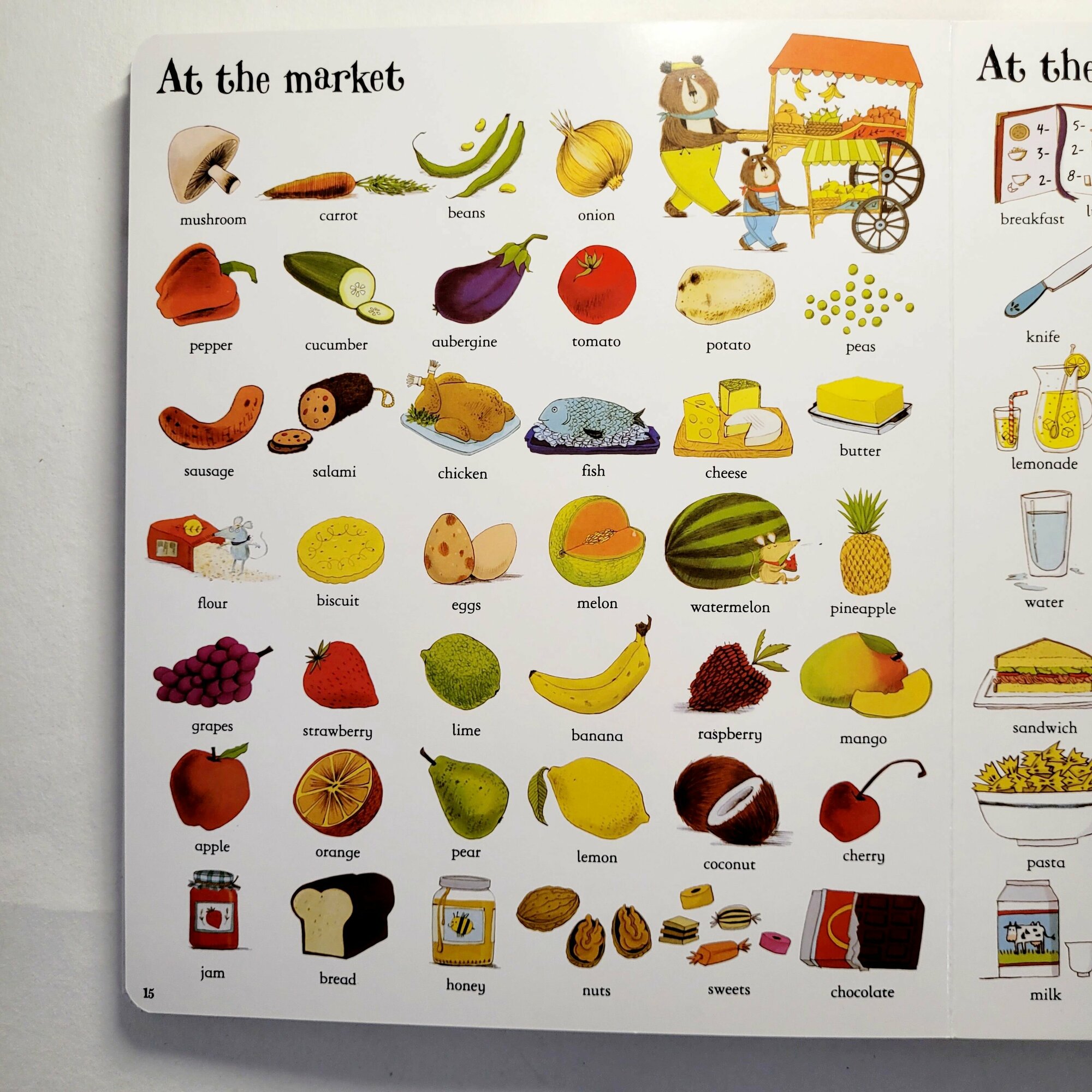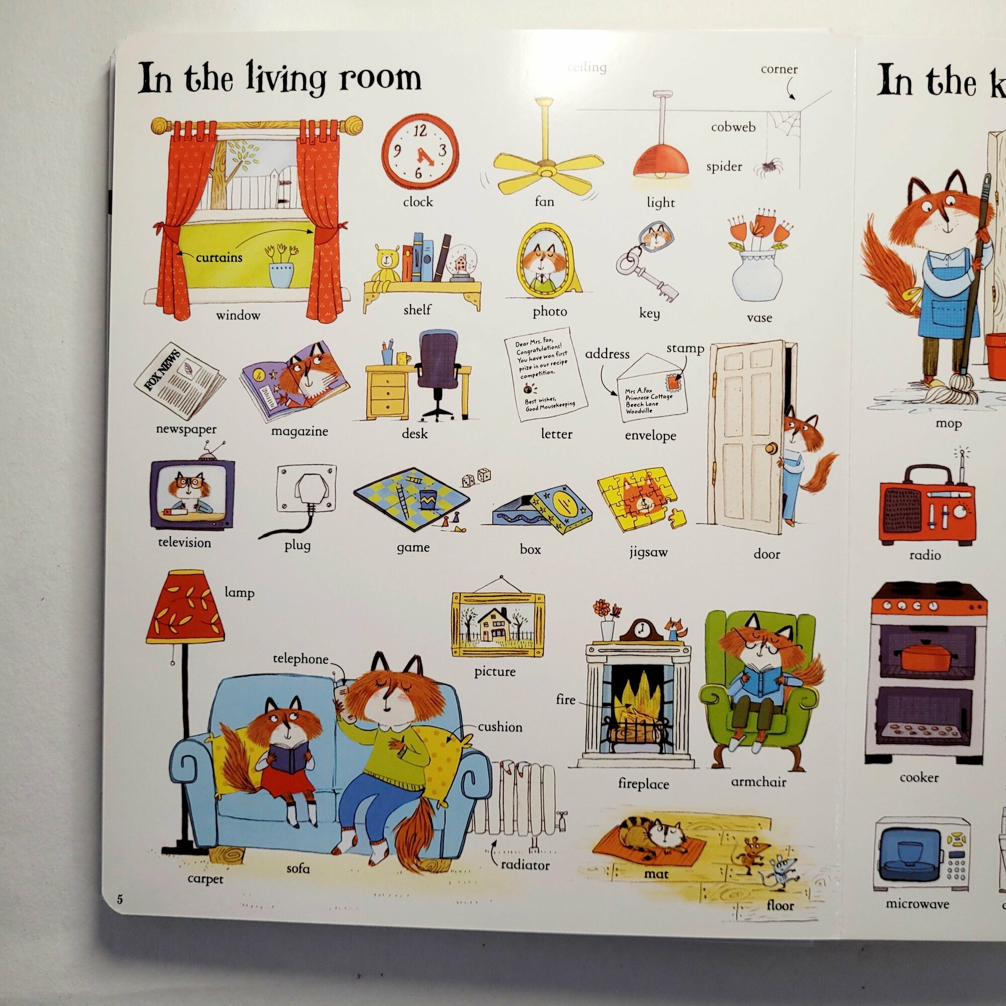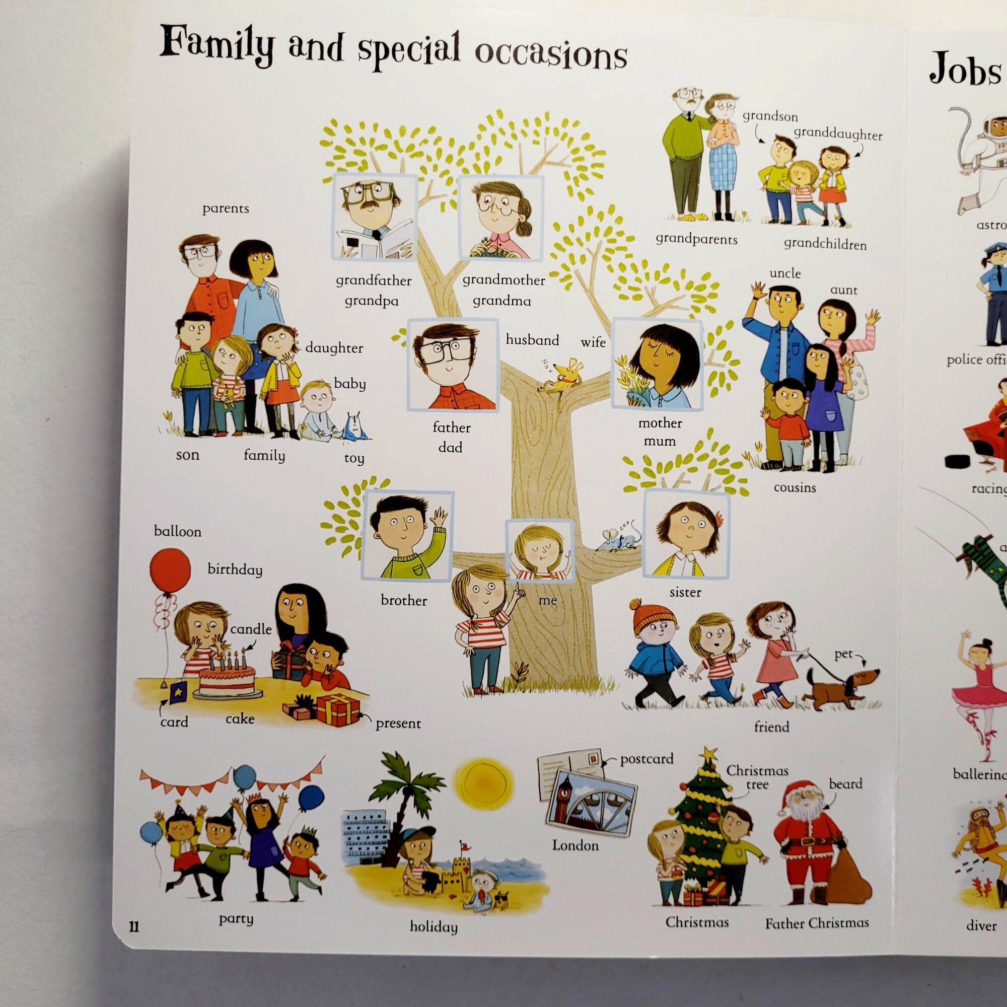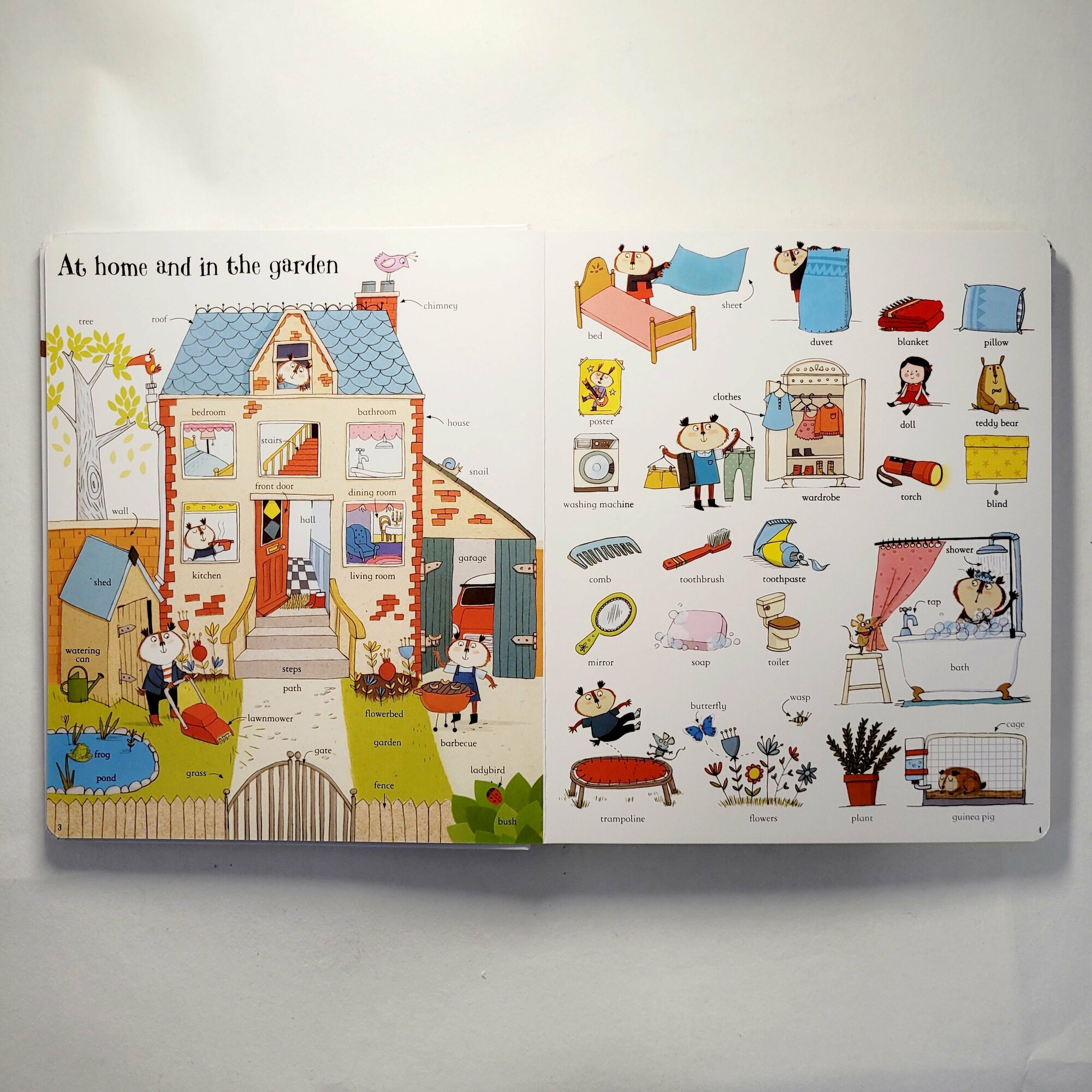 A colourful picture word book with illustrations of around a thousand everyday words. Words are arranged by theme, providing lots to spot and talk about together. A fun way to build a child’s vocabulary, with delightful pictures to pore over. Listen to all the words read by a British English speaker at the Usborne Quicklinks website.