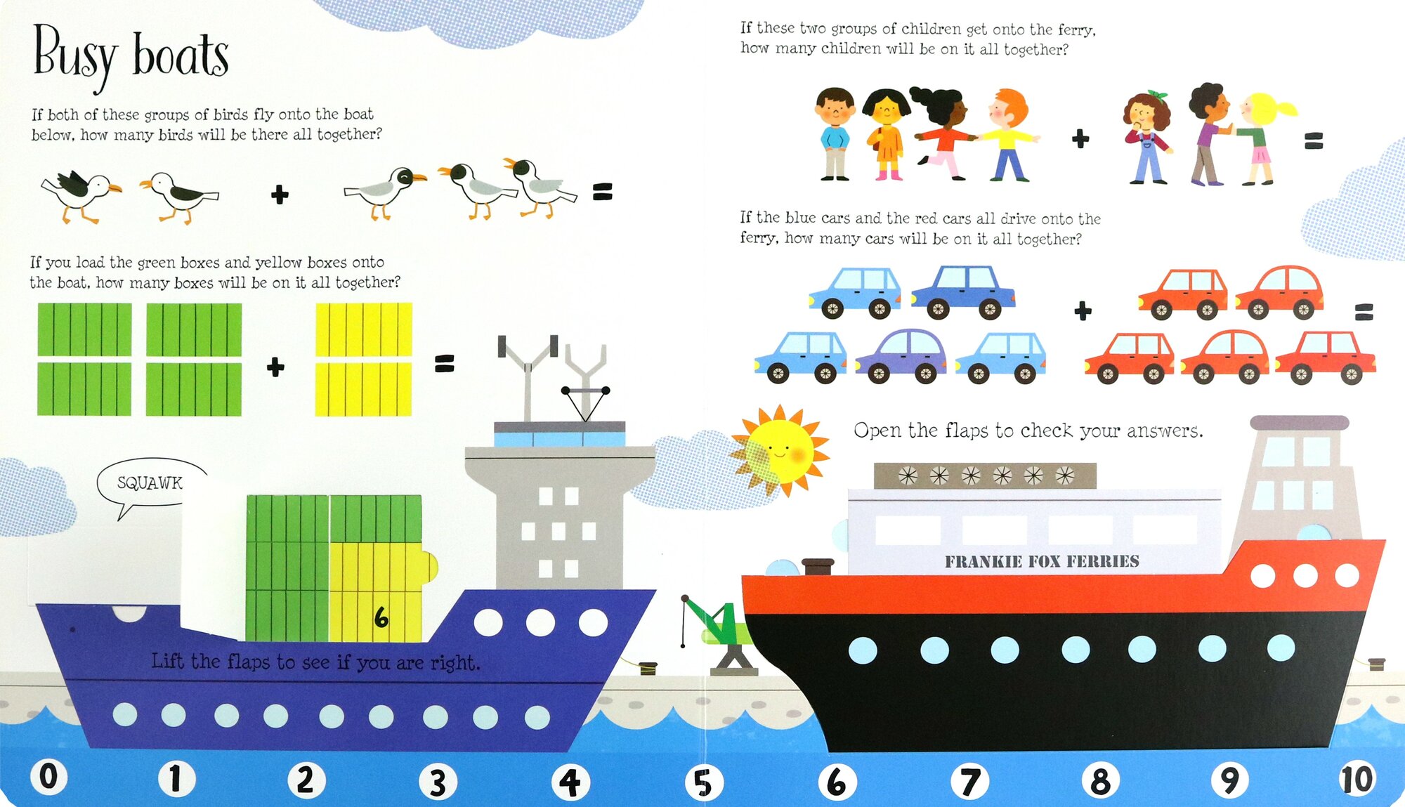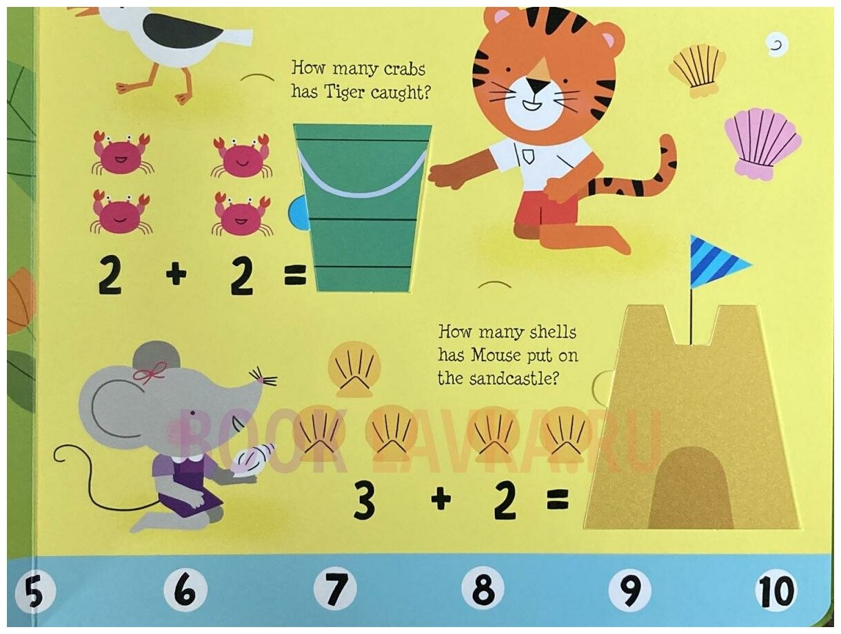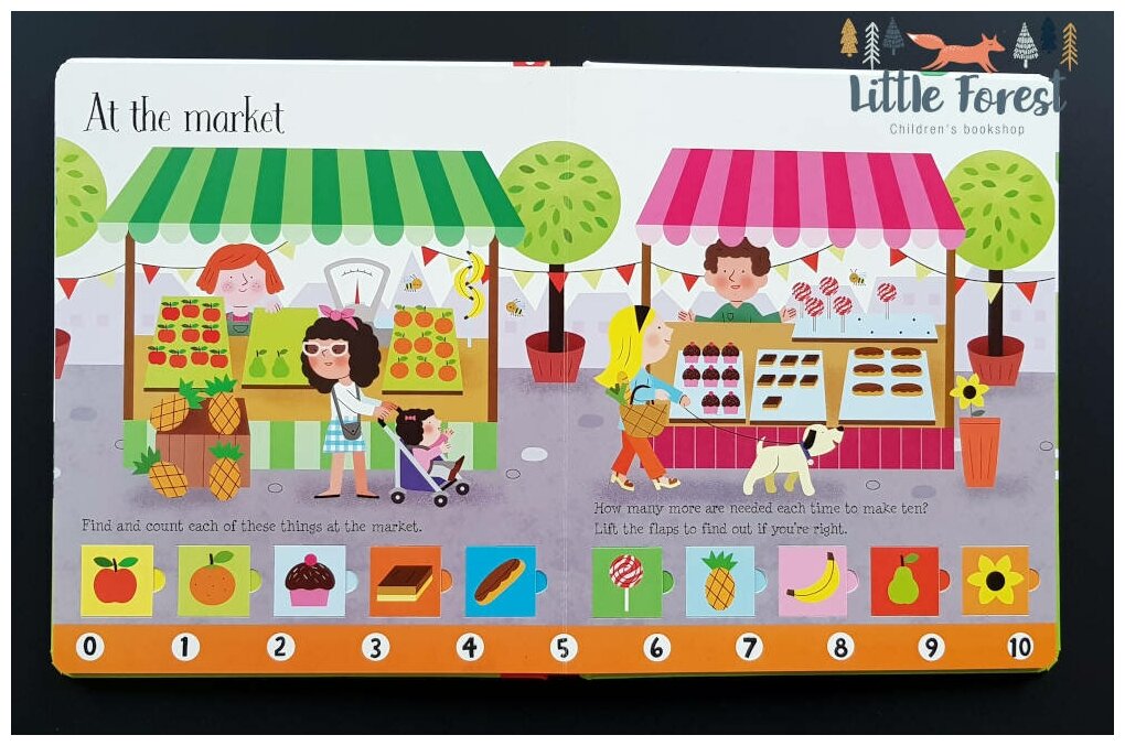 With over 50 flaps to lift, this delightful book helps young children learn how to add and take away numbers from zero to ten. Pages show scenes such as a garden, a beach, a bakery and a market with simple arithmetic questions. Children can do the sums then lift up a leaf, a sandcastle or a tray of tasty jam tarts to reveal the answers.