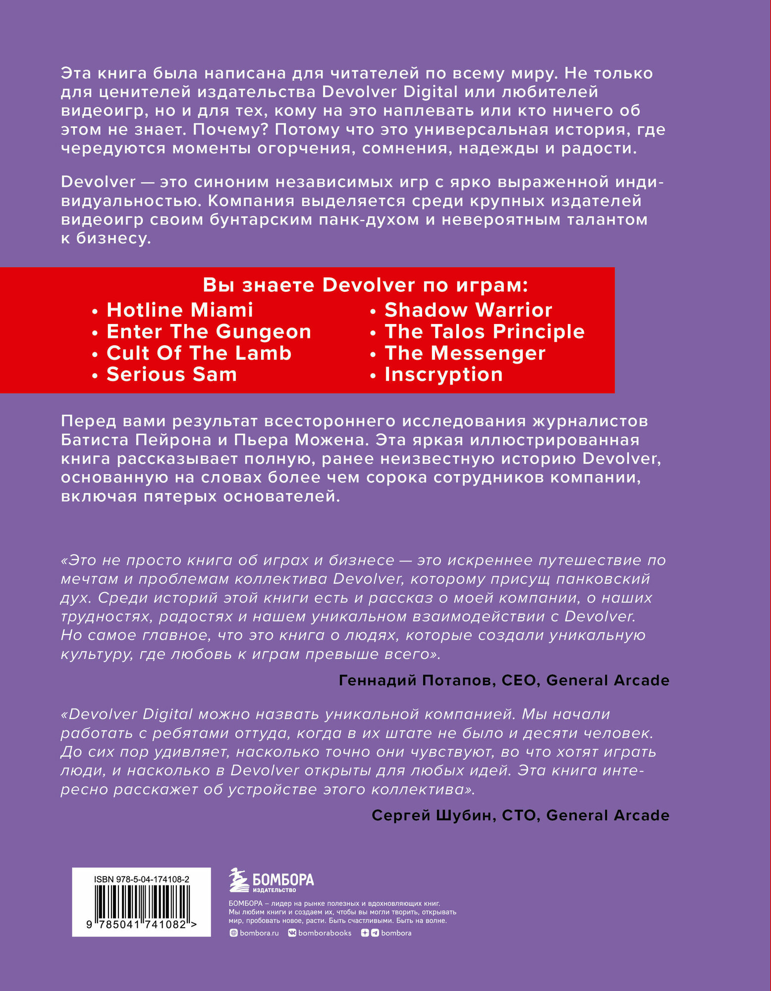 «Это не просто книга об играх и бизнесе — это искреннее путешествие по мечтам и проблемам коллектива Devolver, которому присущ панковский дух. Среди историй этой книги есть и рассказ о моей компании, о наших трудностях, радостях и нашем уникальном взаимодействии с Devolver. Но самое главное, что это книга о людях, которые создали уникальную культуру, где любовь к играм превыше всего». — Геннадий Потапов, CEO, General Arcade