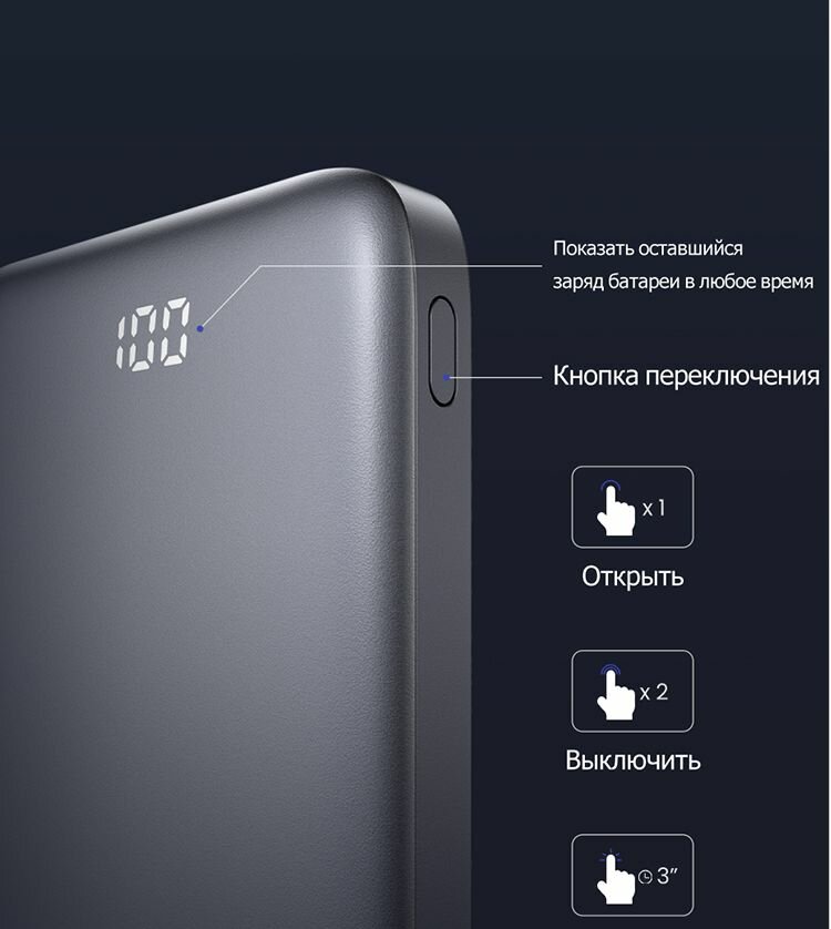 | Особенности | быстрая зарядка, дисплей, индикатор уровня заряда |