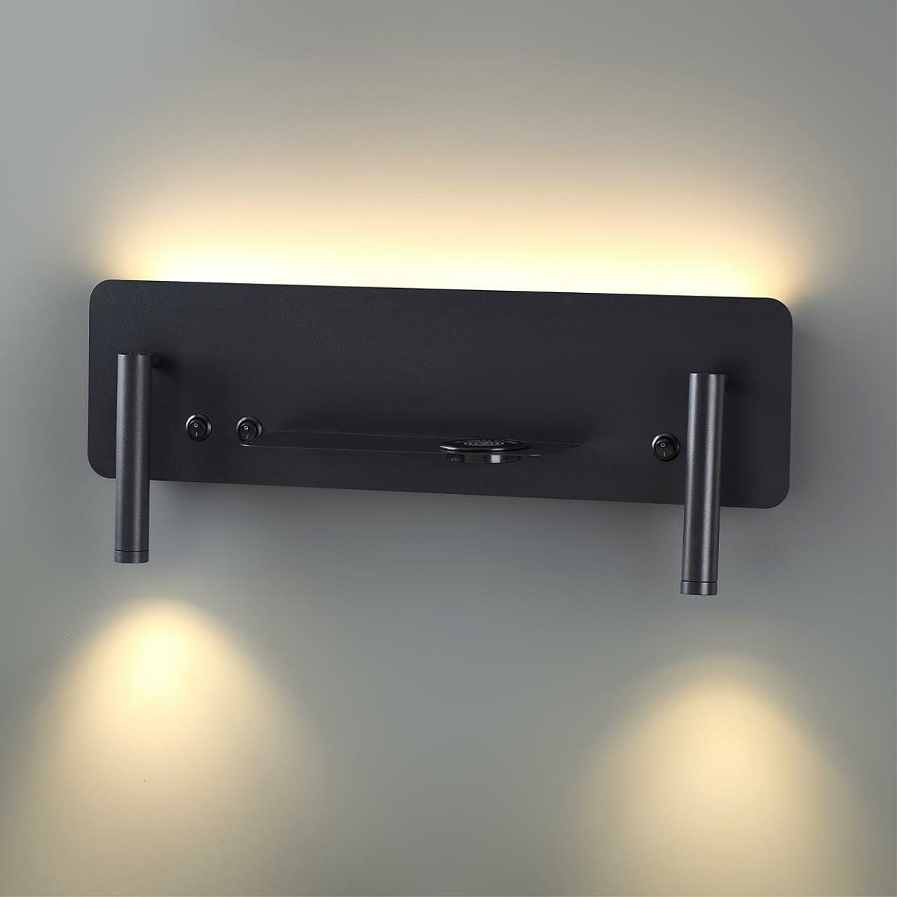 Функциональные настенные светильники Cosi в виде полки со встроенной подсветкой, двумя светодиодными спотами и беспроводной зарядкой идеально впишется в Вашу жилую или рабочую область. Полка предоставляет удобное место для размещения декоративных предметов или важных вещей, а встроенные светодиодные споты обеспечат направленное освещение. Беспроводная зарядка позволит Вам легко и удобно заряжать свои устройства без лишних проводов и перемещений. Этот стильный настенный светильник добавит функциональности и эстетической привлекательности в Ваш интерьер.