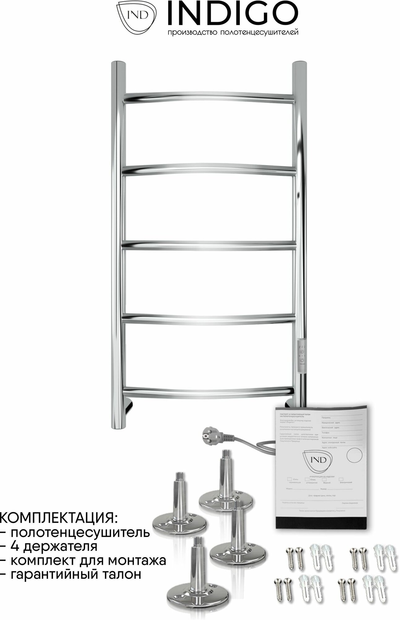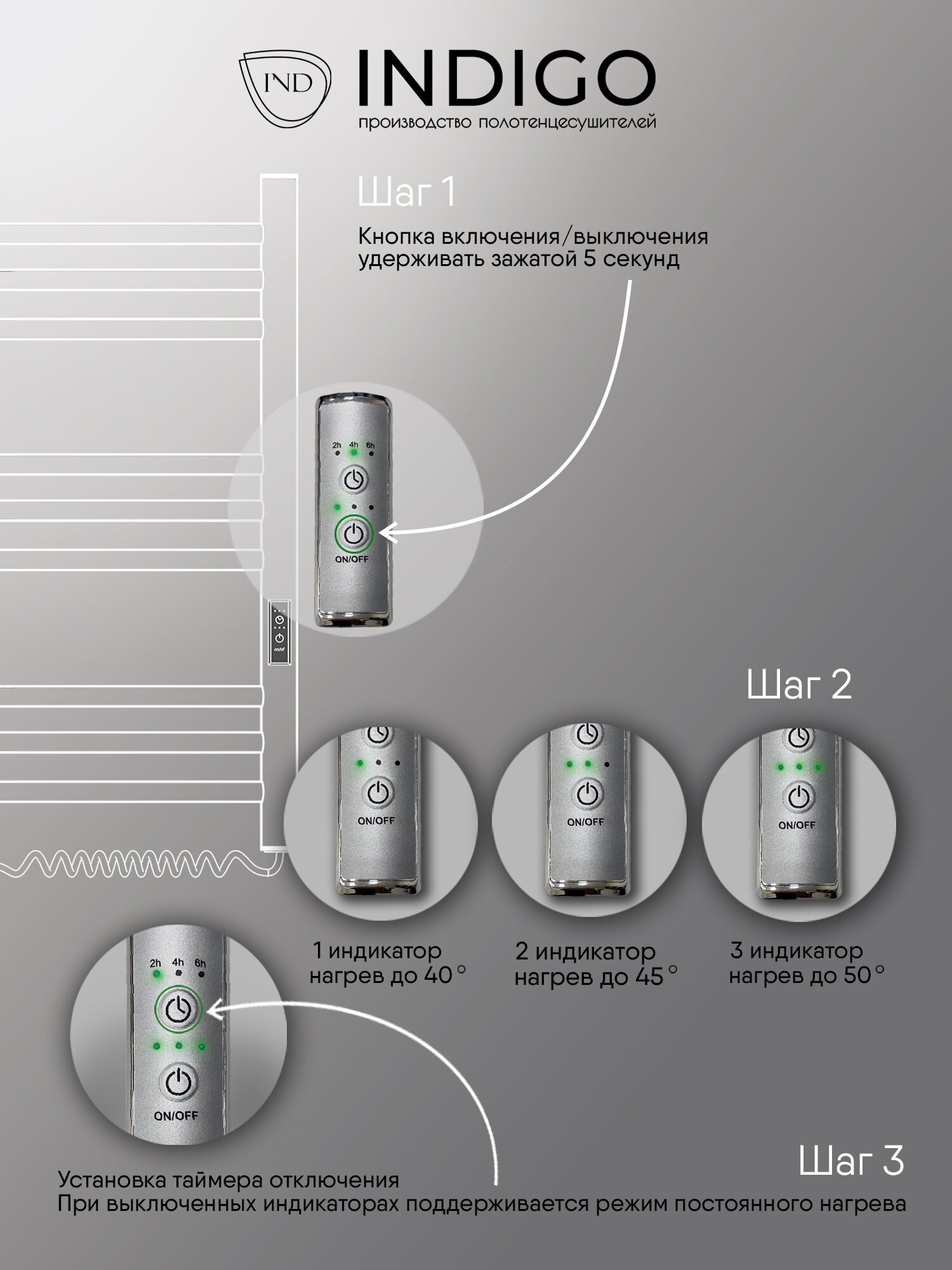 Полотенцесушитель электрический INDIGO Arc Lux с терморегулятором (таймером) создаст комфортную температуру в ванной комнате. С ним полотенца будут теплыми и сухими. Форма - лесенка дуга. Высота - 700 мм, ширина - 300 мм, глубина с держателями - 105 мм. Изделие выполнено из круглой трубы. Материал изделия - это полированная нержавеющая сталь AISI304 толщиной 2 мм c высокими антикоррозийными свойствами. Сталь гармонично сочетается с остальной сантехникой цвета хром. Благодаря мягким классическим формам электрополотенцесушитель прекрасно впишется в интерьер душевой комнаты, прихожей, гардеробной или балкона. Мощность — 70 Вт. При постоянной работе устройство потребляет энергии не больше лампочки. Панель управления находится на правой части стойки. Регулятор нагрева имеет три режима - 40, 45, 50 градусов, а таймер можно настроить на отключение через 2, 4, 6 часов. Включать сушилку настенную можно по необходимости, но создана она для круглосуточной работы. Класс защиты IP44 гарантирует безопасность использования во влажной среде и защиту от брызг, а надёжная гидроизоляция и грамотно рассчитанное сечение нагревательного элемента не дают изделию перегреваться. Нагревательный кабель "сухой ТЭН" установлен по всей длине металлического корпуса. Поверхность нагревается в течение получаса до максимума в 55°С. Подключение осуществляется двумя способами: скрытое подключение к электропроводке через модуль скрытого подключения в стену или прямым электропроводом длиной 1,1 метра в розетку. Модуль скрытого монтажа уже в сборе. Провод с вилкой легко переставляется на необходимую сторону, благодаря наличию клемм в обеих частях стойки. Электрический змеевик, в отличие от водяного, никогда не протечёт, не подвержен коррозии блуждающих токов, не зависит от отопительных сезонов и наличия горячего водоснабжения. Для простоты установки полотенцесушитель для белья настенный полностью укомплектована. В комплектацию входят: 4 телескопических держателя, компенсирующие неровности стен, комплект монтажа (дюбели и саморезы), электрошнур с вилкой, инструкция с гарантийным талоном на 3 года. Срок службы изделия не ограничен. Для безопасной транспортировки прибор упаковывается в полиэтилен и пятислойную картонную коробку. Ассортимент интернет-магазина сантехники IND (INDIGO) насчитывает 300+ моделей в 9 цветах и различных размерах. Выбирая INDIGO вы получаете надежный продукт с гарантией качества Российского производителя.