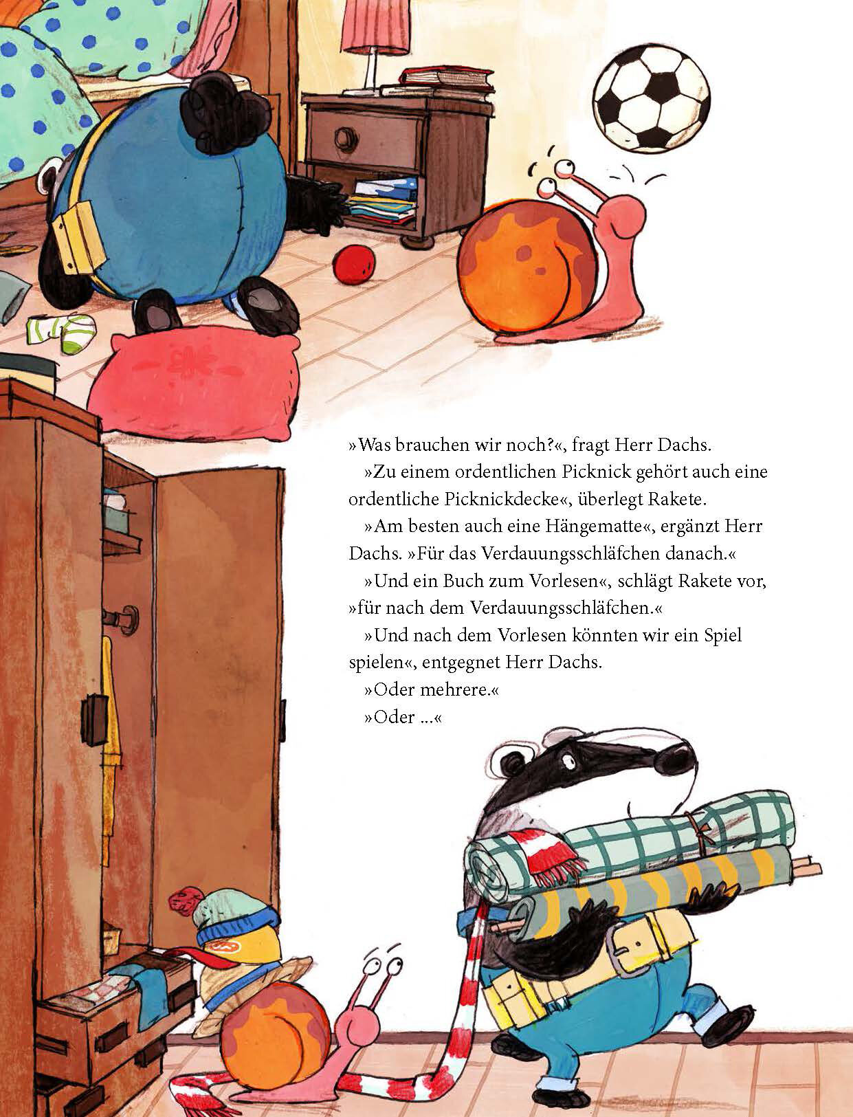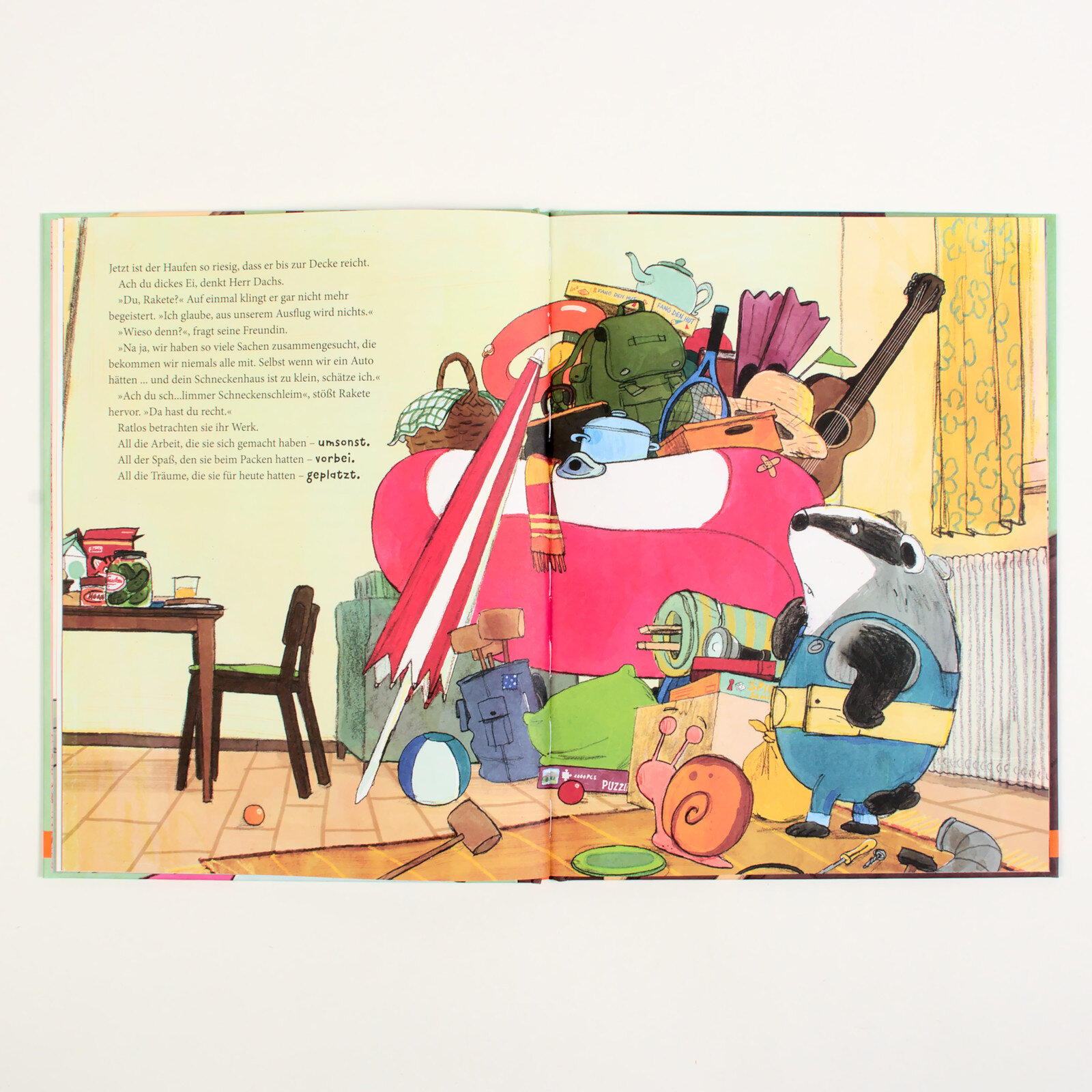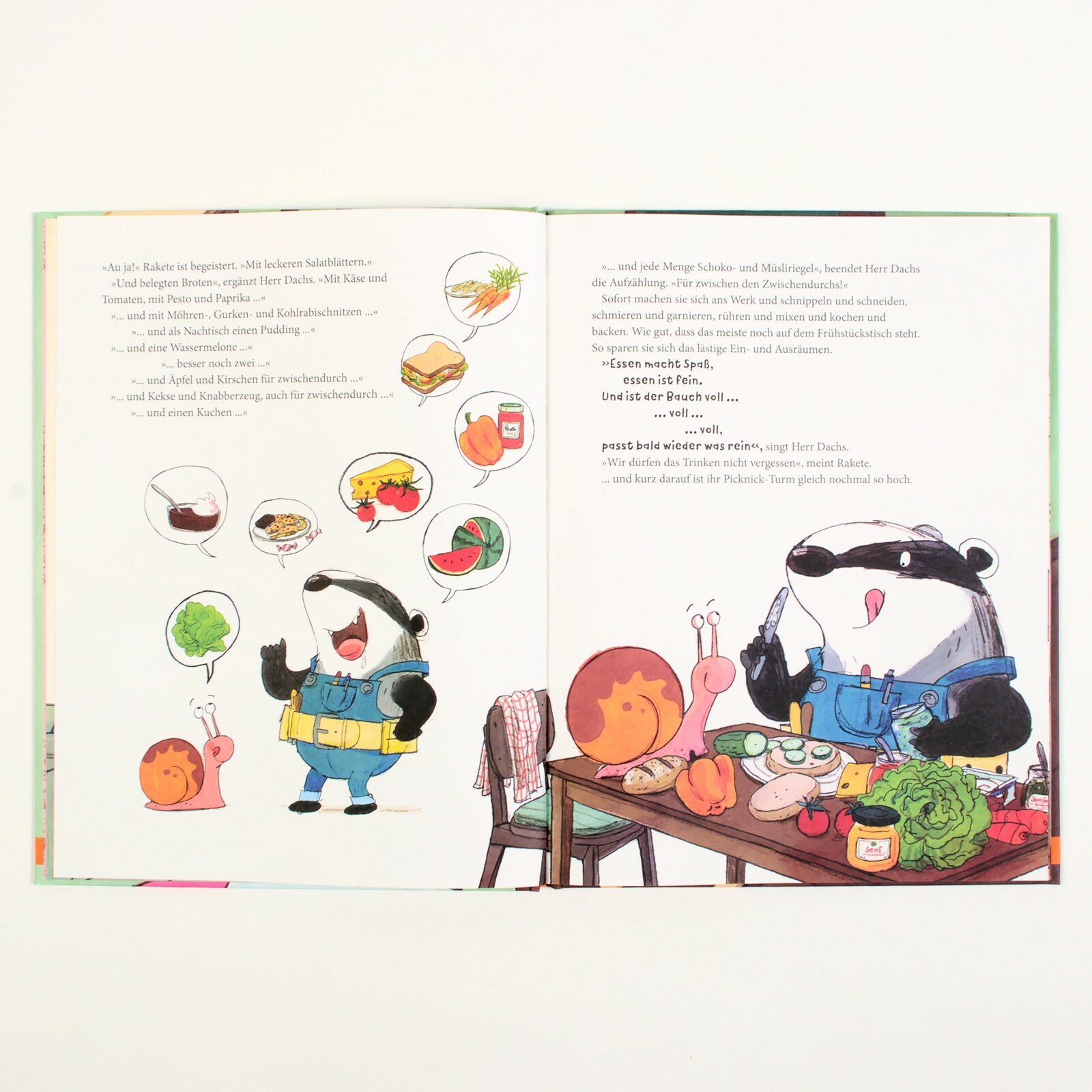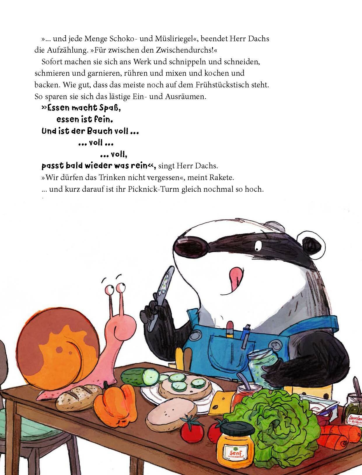 Das erste Bilderbuch von Herrn Dachs und Schnecke Rakete! Beide haben gro?e Lust auf einen Ausflug mit Picknick. Also packen sie zusammen: Kohlrabischnitzen, Oliven, Wassermelone, Knabberzeug, Schokokuchen, Pudding, Decke, Thermosflasche, Bucher, Wikingerschach, Badesachen, Regenzeug, Schlauchboot, Seil und Hangematte … wer soll das blo? alles tragen? Rakete hat die Losung: Hausflug statt Ausflug ist angesagt! Und da mischen naturlich alle Freunde aus dem Haus begeistert mit! Eine Bilderbuchgeschichte voller Leichtigkeit, mit frohlichen und detailreichen Bildern, die enorme Lust auf Abenteuer macht.