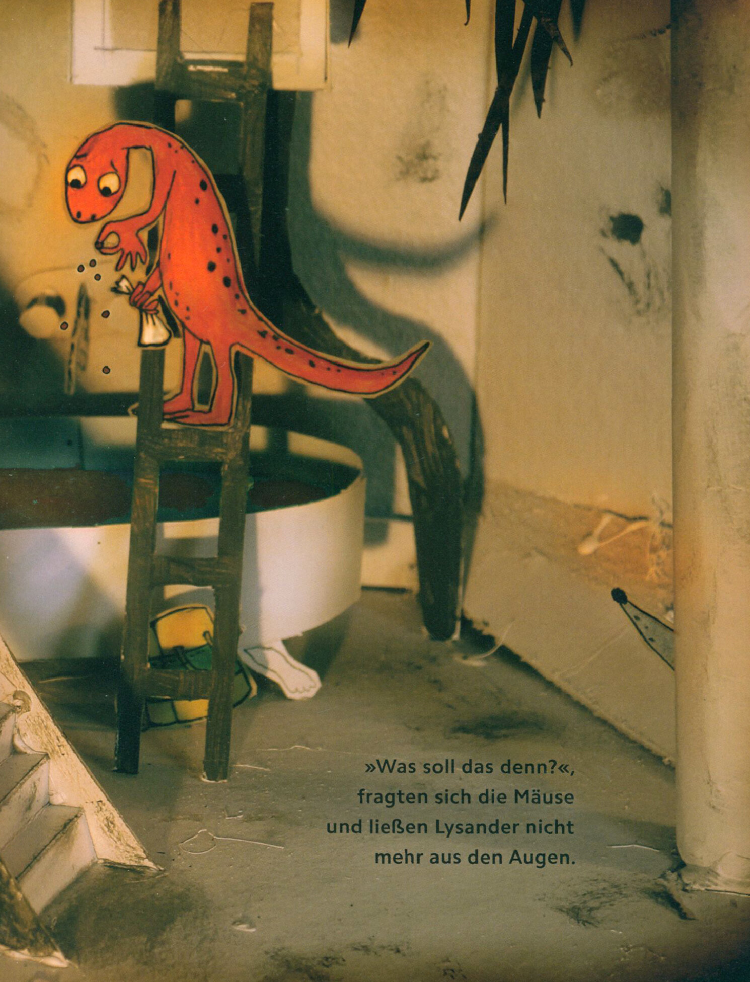 Ein Brief des Burgermeisters verandert das beschauliche Leben der Mause in ihrer unterirdischen Hohle: Es soll jemand bei ihnen einziehen, der sein Zuhause verloren hat. »Wo soll der denn schlafen? Wir haben doch keinen Platz! Und die Kartoffeln reichen auch nicht fur alle.« Aber es dauert nicht lange und Lysander ist da. Er ist ein roter Lurch und furchtbar mude. Da Mause nicht gerne baden, bekommt er die Badewanne zugewiesen. Doch als er sie mit Erde und Kornchen fullt, platzt den Mausen der Kragen. Aber Lysander gelingt es, der Mausewelt etwas hinzufugen, was allen gefallt und er darf bleiben.