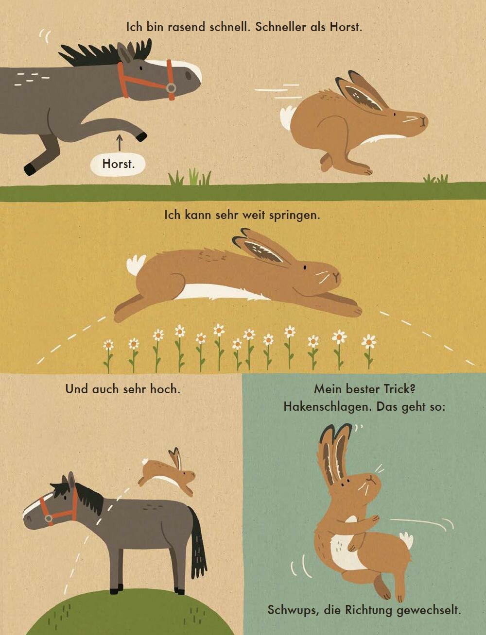 Gut verborgen im Dickicht zeigt sich der Feldhase nur selten – und kaum hat man ihn erspaht, ist er schon davongesprungen. Auf 7 Doppelseiten mit warmherzigen Illustrationen und kurzen Texten zeigt Katrin Wiehle, wie der schnelle Hakenschlager mit den gro?en Ohren lebt, was er am Liebsten frisst und warum er nicht mit Kaninchen verwechselt werden will. Im Bewusstsein fur Umweltschutz und Nachhaltigkeit, mit Okofarben auf Recyclingpapier gedruckt: das ist unser 100% Naturbuch.