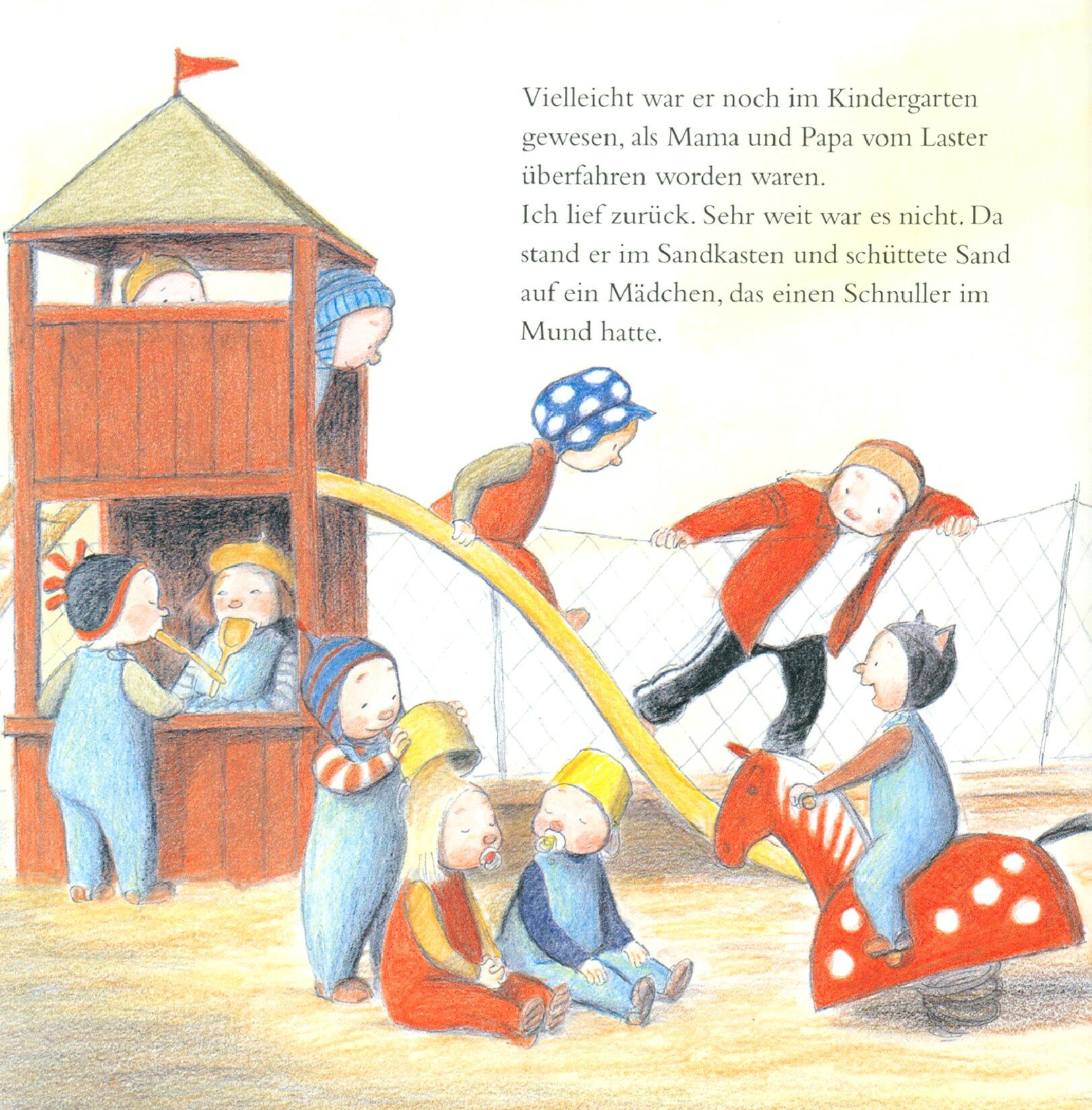 „Einmal lernte ich im Kindergarten die Uhr. Neun Uhr, zehn Uhr, ein Uhr, zwei Uhr.“ Als Papa um drei Uhr nicht wie gewohnt auftaucht, macht sich der Ich-Erzahler auf den Heimweg. Aber niemand ist zu Hause! Kein Papa, keine Mama. „Bestimmt waren meine Eltern tot. Vielleicht hatte ein Laster sie uberfahren. Ich setzte mich auf die Treppe und weinte.“