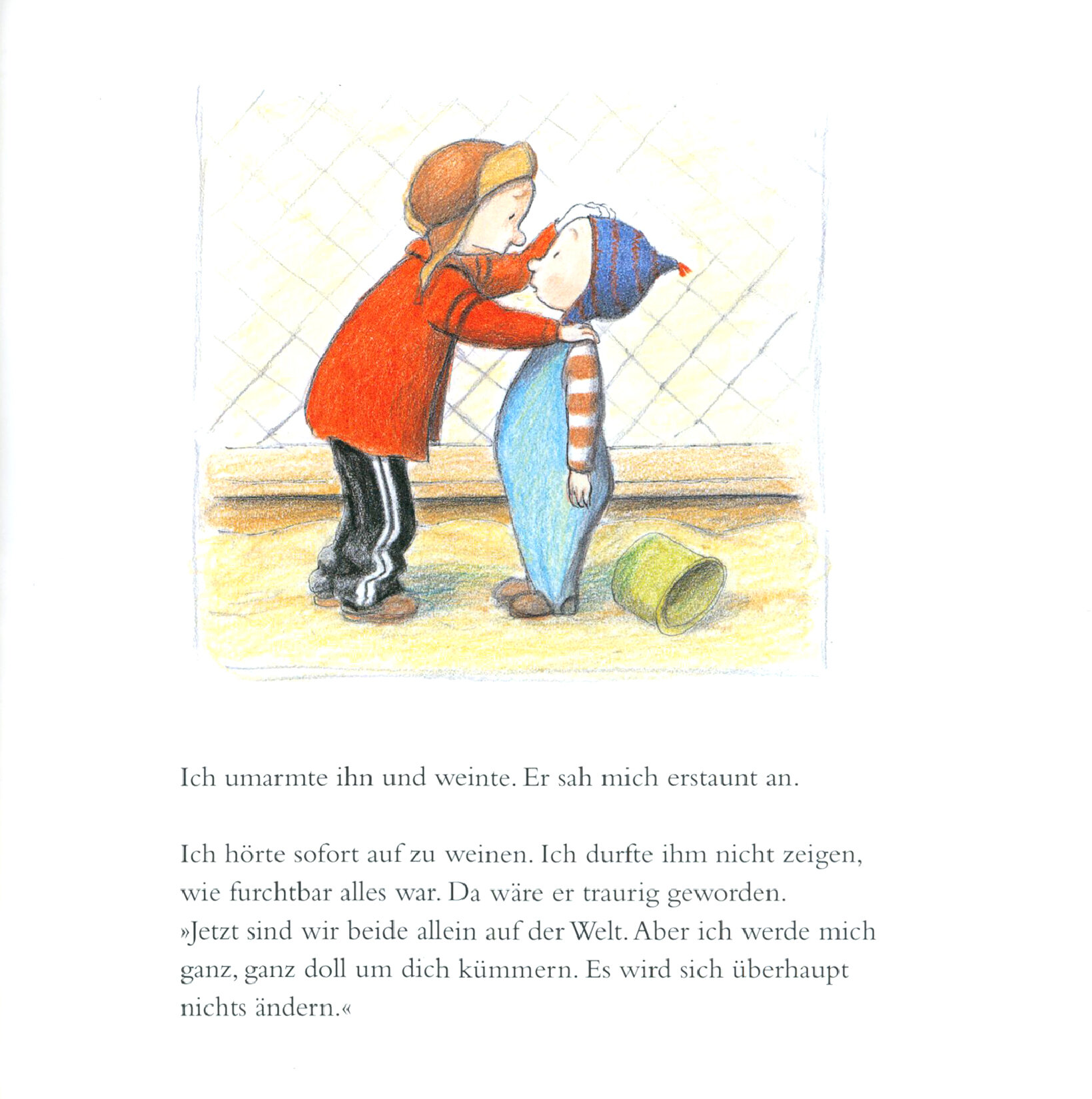 Damit beginnt eine gro?artige Geschichte, die tief in Kinderseelen blicken lasst, denn es gibt da noch einen kleinen Bruder, um den es sich zu kummern gilt: „Ich durfte ihm nicht zeigen, wie furchtbar alles war.“ Also bauen beide im Garten aus herumliegenden Brettern erstmal ein Haus und aus einem Karton einen Fernseher. Damit der auch was zeigt, spielt der Gro?e fur den Kleinen das Fernsehprogramm. Plotzlich tauchen ganz unvermittelt die Eltern auf. So ein Gluck!