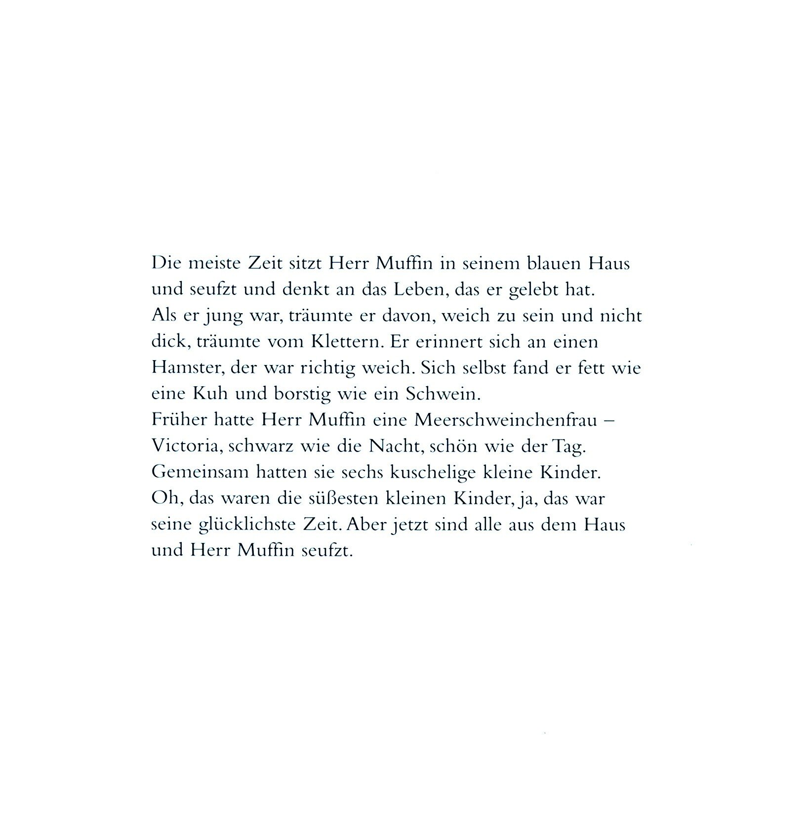 Herr Muffin ist ein Meerschweinchen. Ein Meerschweinchen, dessen Tage gezahlt sind. Er wohnt in einem umgedrehten blauen Karton. Herr Muffin bekommt gerne Post. Auch wenn er seine Briefe meistens aufisst. Oft sitzt er in seinem blauen Haus und denkt an sein Leben.