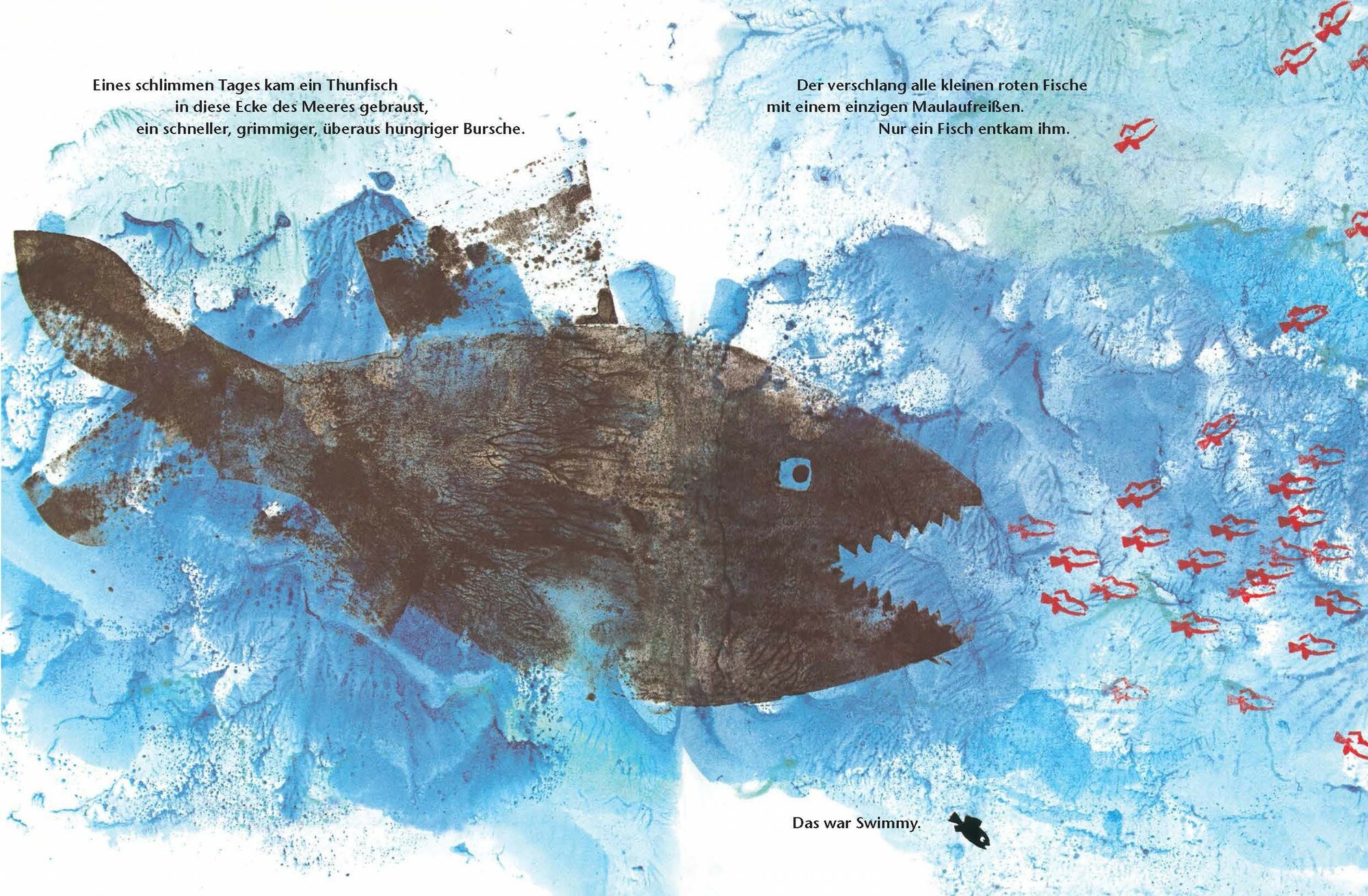 Der winzige, aber kluge Fisch Swimmy will ins gro?e Meer hinaus. Denn dort warten die Wunder! Die kleinen roten Fische aber haben Angst vor den riesigen Fischen dort drau?en. Swimmy uberlegt und uberlegt. Und endlich hat er eine Idee. "Ich hab's!", ruft er frohlich. "Lasst uns etwas ausprobieren." Und schon bald schwimmt der Schwarm kleiner Fische in Form eines Riesenfisches in das weite Meer hinaus. Und wirklich - die Riesenfische wagen nicht, in ihre Nahe zu kommen. Und so schwimmen noch heute viele kleine Fische, getarnt als Riesenfisch, glucklich durch das Meer.