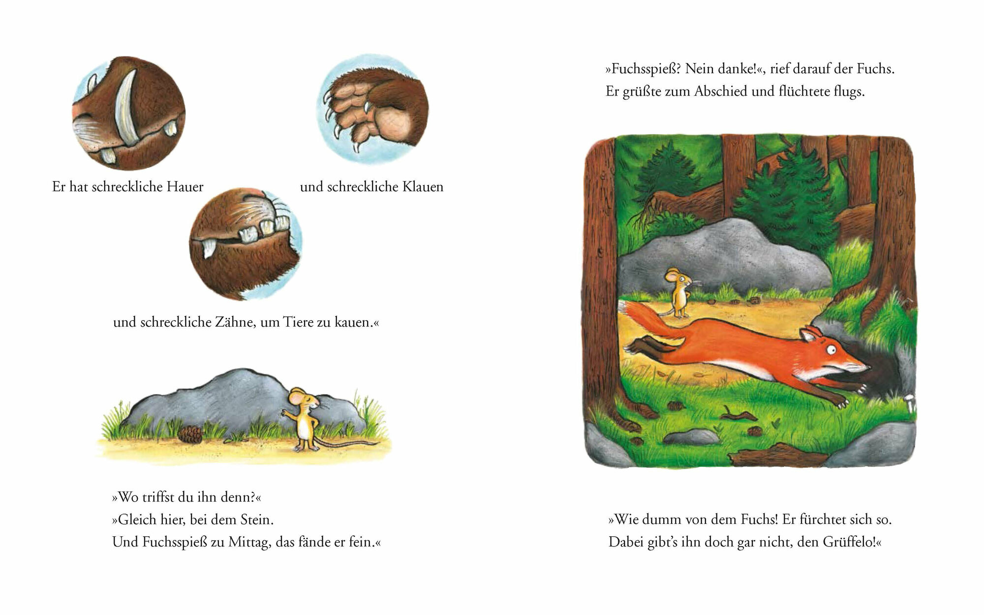 Die kleine Maus ist unterwegs im Wald und alle scheinen es gut mit ihr zu meinen. Der Fuchs ladt sie zur Gotterspeise ein, die Eule bittet zum Tee und die Schlange zum Schlangen-Mause-Fest. Aber die Maus hat immer schon eine Verabredung: mit ihrem Freund, dem schrecklichen Gruffelo. Den hat sie sich zwar nur ausgedacht, aber wenn sie ihn ihren Mochte-gern-Gastgebern beschreibt, wollen die doch lieber alleine speisen. Der Gruffelo ist ein praktischer ausgedachter Freund! - Doch dann taucht er auf einmal wirklich auf, und sein Lieblingsschmaus, sagt er, ist Butterbrot mit kleiner Maus. Das ist nicht so praktisch. Aber was eine clevere kleine Maus ist, die lehrt auch einen Gruffelo in echt das Furchten.