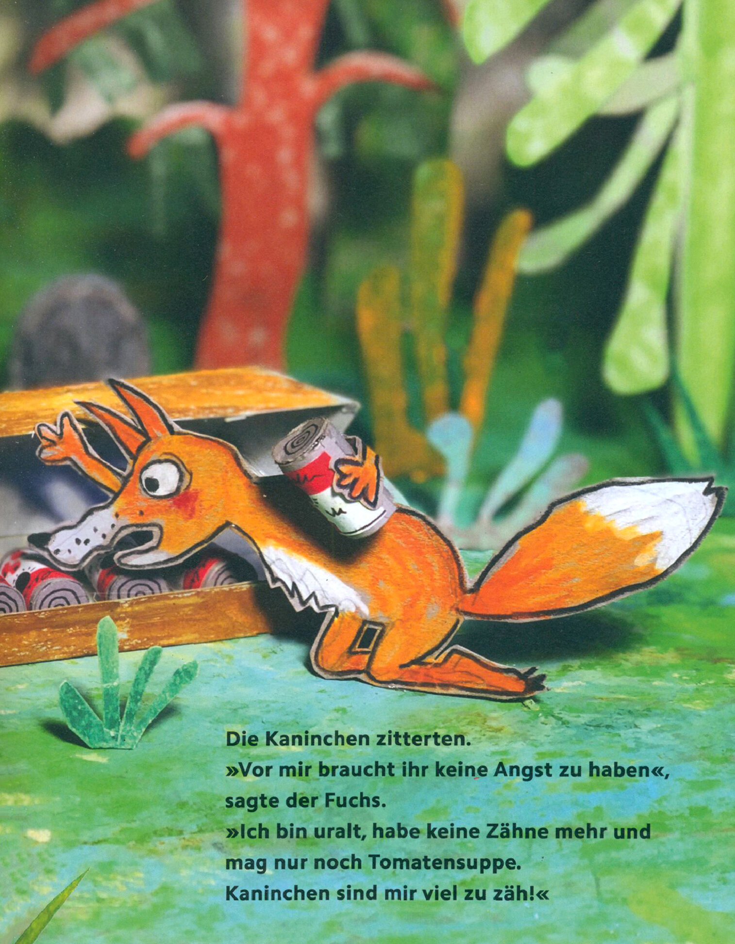 Ein Fuchs kommt in den Wald. Er schleppt eine gro?e Kiste mit sich, die mit Tomaten- suppendosen gefu?llt ist, denn er ist zahnlos und alt. Das begreifen bald auch die Kaninchen, die sich zuerst vor ihm gefu?rchtet hatten, und so lernen sich welche kennen, die eigentlich nichts gemeinsam haben. Der Fuchs erza?hlt aus seinem langen Leben und bringt den Kaninchen wichtige Weisheiten bei. Die wiederum begleiten ihn, als der alte Fuchs stirbt. Nach seinem Tod legen sie ihn in seine gro?e Kiste, begraben ihn und nehmen Abschied. Doch in ihren Erinnerungen bleibt er lebendig.