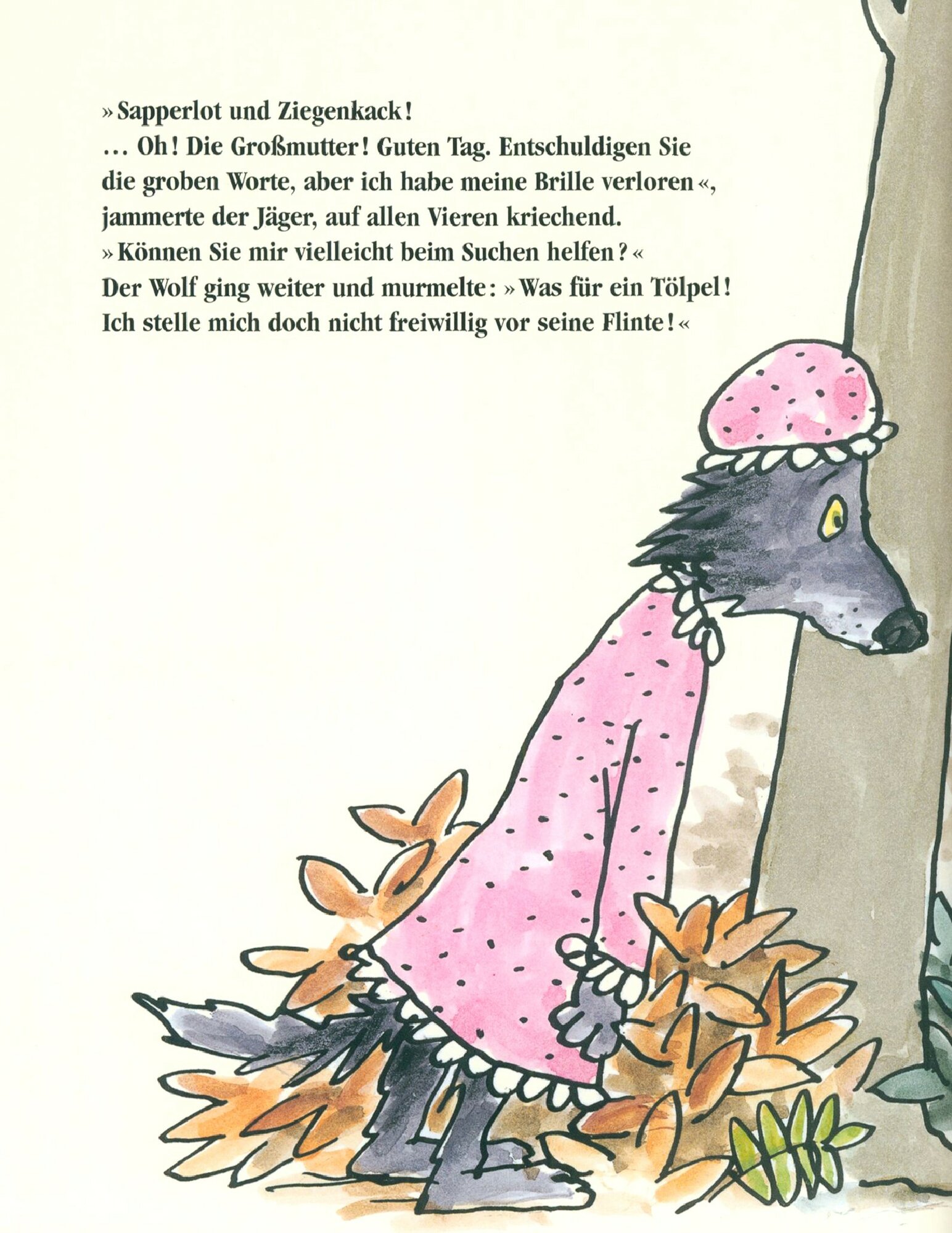 An einem sonnigen Sommertag begegnet Rotkappchen dem Wolf. Als dieser hort, dass sie auf dem Weg zur Gro?mutter sei, beschlie?t er, dass es heute zum Hauptgang Gro?mutter und als Vorspeise Rotkappchen geben soll. Dann aber entdeckt er das Nachthemd der alten Dame, schlupft hinein – und der Rollentausch ist perfekt: Alle halten ihn fur die Gro?mutter! Was dann passiert, ist so turbulent, lustig und absurd, dass diese Geschichte das Zeug hat, zu einem richtigen Vorlese-Lieblingsbuch zu werden. Auch wenn selbst Rotkappchen das Spiel nicht ganz durchschaut, kommt doch alles zu einem guten und hochst uberraschenden Ende!