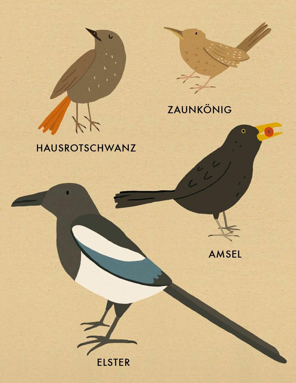 Amsel – Bachstelze – Blaumeise – Buchfink – Buntspecht – Eichelhaher – Elster – Feldlerche – Goldammer – Hausrotschwanz – Hausspatz – Kuckuck – Mauersegler – Mausebussard – Nachtigall – Rauchschwalbe – Rotkehlchen – Saatkrahe – Stadttaube – Star – Storch – Uhu – Wanderfalke – Zaunkonig