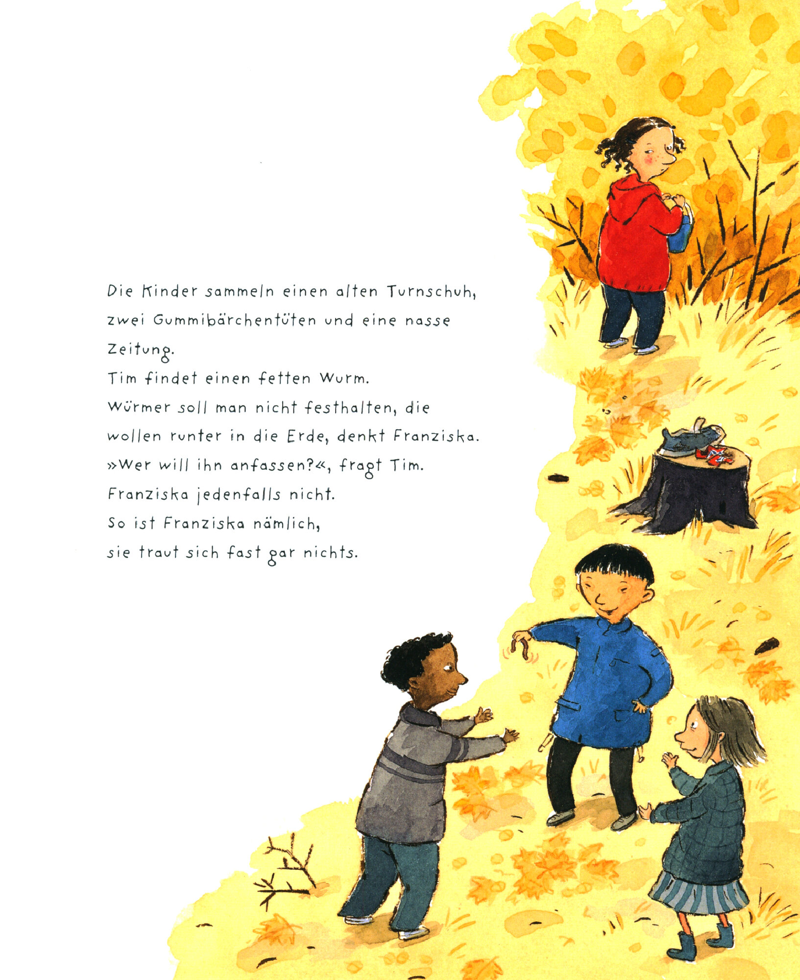 Franziska ist vorsichtig und nicht besonders mutig. Sie streichelt keine fremden Hunde und springt nicht uber tiefe Graben. Doch als beim Kindergartenausflug plotzlich alle weg sind, ist sie auf einmal ganz allein im Wald. Statt den Weg zuruck findet sie ein Rudel Wolfe. Angst spielt auf einmal keine Rolle mehr fur sie, denn die Wolfe wollen unterhalten werden. Also spielt Franziska mit ihnen, kocht fur sie Schlammbambersuppe und singt ihnen traurige Lieder zur Nacht. So ist Franziska der beste Spielkamerad, den die Wolfe je hatten. Am nachsten Morgen findet sie auch wieder in den Kindergarten zuruck. Und ab sofort traut sie sich allerhand zu!