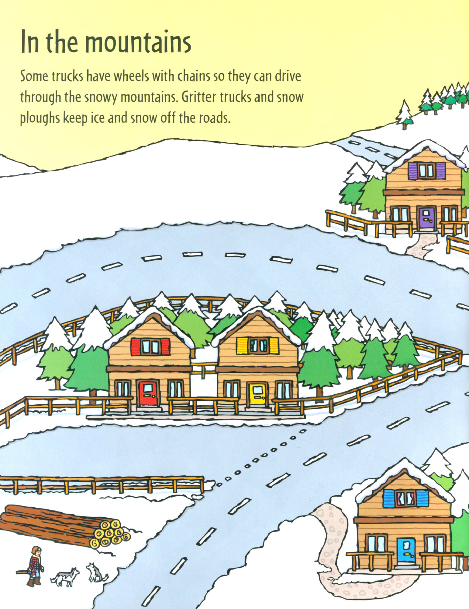 Each colourful scene is begging to be filled with diggers, cranes, trucks, bulldozers and workers. Simple text gently suggests which scene needs which big vehicles.