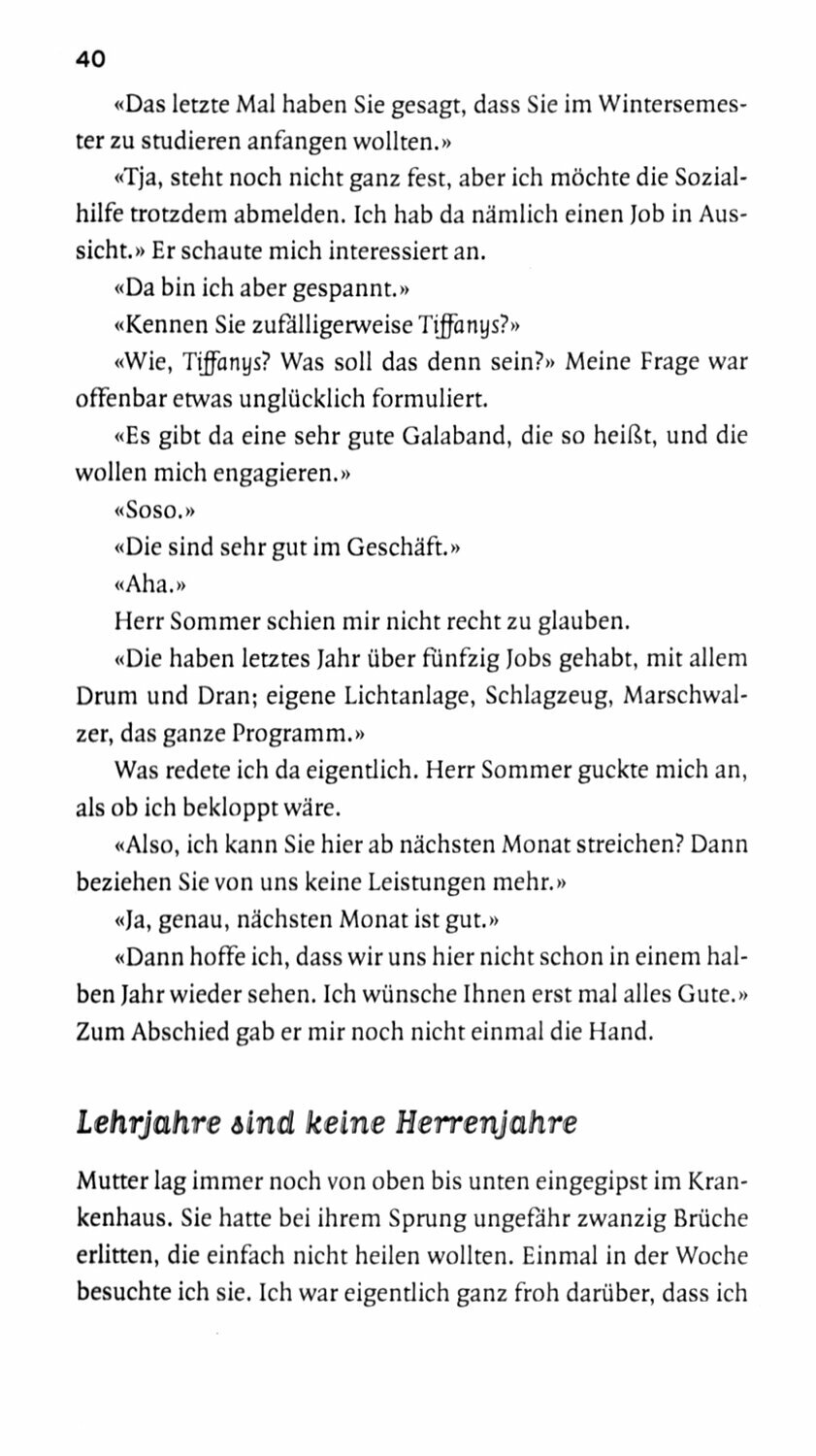 Wie es ist, in Harburg aufzuwachsen, das wei? Heinz Strunk genau. Harburg, nicht Hamburg. Mitte der 80er ist Heinz volljahrig und hat immer noch Akne, immer noch keinen Job, immer noch keinen Sex. Doch dann wird er Blaser bei Tiffanys, einer Showband, die auf den Schutzenfesten zwischen Elbe und Luneburger Heide bald zu den gro?ten gehort. Aber auch das Musikerleben hat seine Schattenseiten: traurige Gaststars, heillose Frauengeschichten, sehr fettes Essen und Hochzeitsgesellschaften, die immer nur eins horen wollen: „An der Nordseekuste“ von Klaus und Klaus.