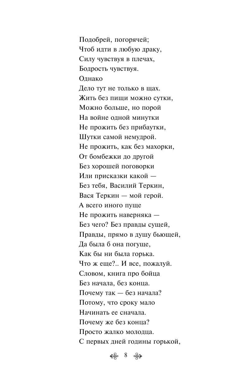 Александр Твардовский сумел передать весь героизм простого советского солдата искусно и выразительно. В книгу вошли также известные стихотворения "Я убит подо Ржевом ", "Рассказ танкиста", "В тот день, когда окончилась война" и другие произведения. Стихотворения Александра Твардовского и поэма "Василий Тёркин" стали одними из основных шедевров советской литературы, побуждающих задуматься о смысле человеческой судьбы и ценности мирной жизни.