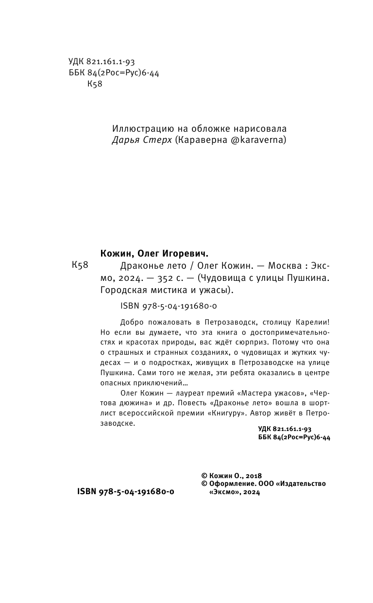 Олег Кожин — лауреат премий «Мастера ужасов», «Чёртова дюжина» и др. Повесть «Драконье лето» вошла в шорт-лист всероссийской премии «Книгуру». Автор живёт в Петрозаводске.