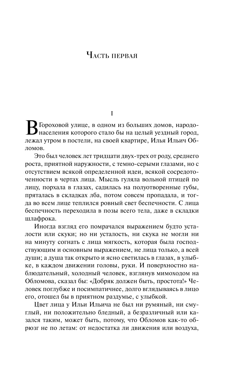 Такую же размеренность и неторопливость автор заложил и в образ главного героя. Добрый, умный и поэтичный помещик Илья Ильич Обломов мог бы иметь все, что пожелает, однако проводит свои дни в ленном ничегонеделании на любимом диване, предаваясь воспоминаниям и грезам.