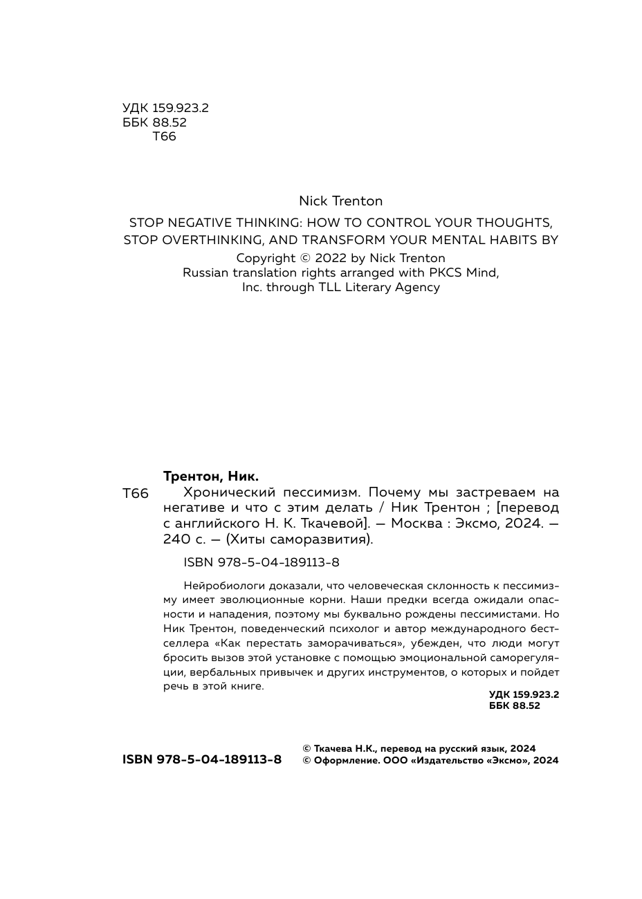 Хронический пессимизм. Почему мы застреваем на негативе и что с этим делать (Ник Трентон); Эксмо, БОМБОРА, 2023