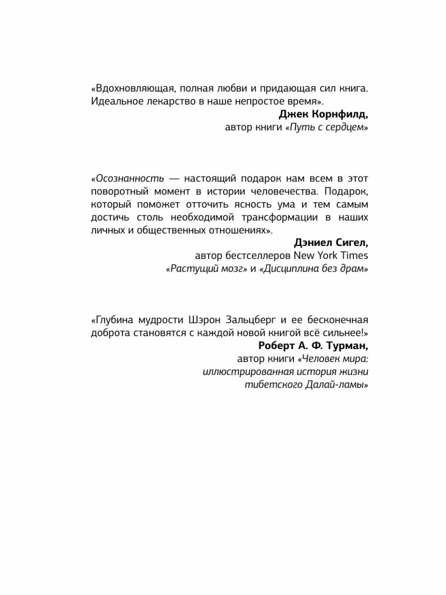 В современной жизни почти каждый день приносит будоражащие новости, вызывающие гнев, горе и боль. Постоянный страх и тревожность заставляют людей чувствовать себя подавленными, что часто приводит к апатии, выгоранию и депрессии. В своей книге Зальцберг объясняет, как использовать осознанность для развития внутренней силы, обретения баланса и исцеления себя самих и мира вокруг. Она говорит о том, что медитация — это не замена действию, а скорее способ проявить щедрость по отношению к самому себе, избавиться от рамок и ловушек мышления и напитаться энергией для здорового существования.