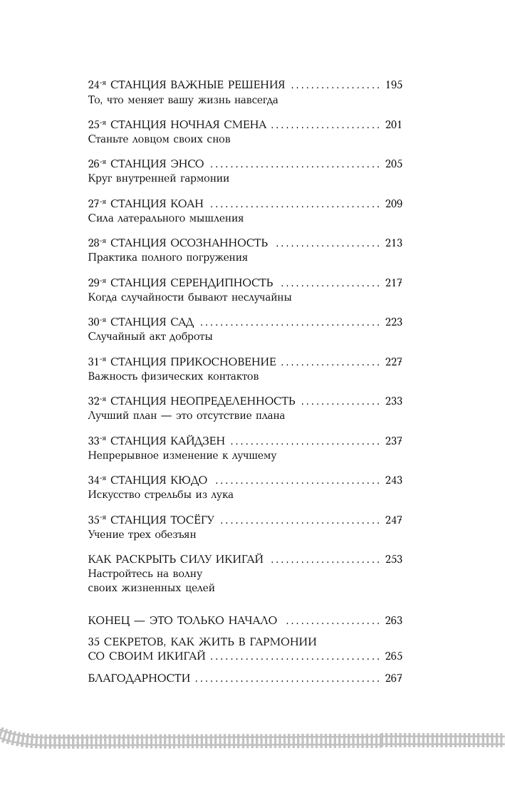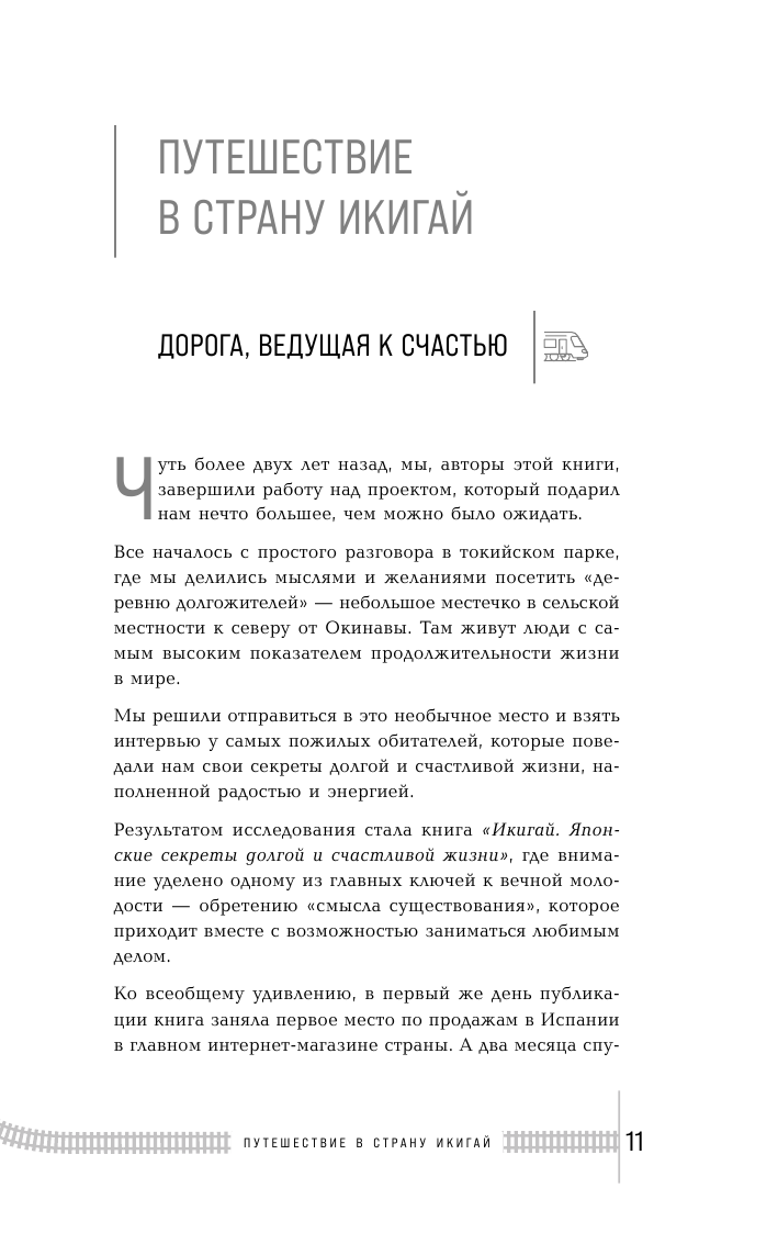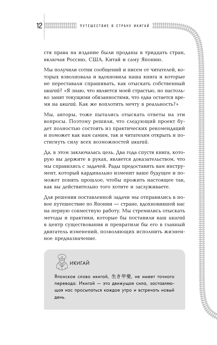 Японцы полагают, что у каждого есть свой икигай – предназначение, то, ради чего стоит вставать по утрам. В этой книге Эктор Гарсиа и Франсеск Миральес приглашают вас в увлекательное путешествие, в ходе которого вы переосмыслите вашу жизнь и постигните силу всех возможностей икигай. На пути вы совершите 35 остановок, где вас ждут практические упражнения, которые помогут наполнить жизнь смыслом и приблизиться к целям.