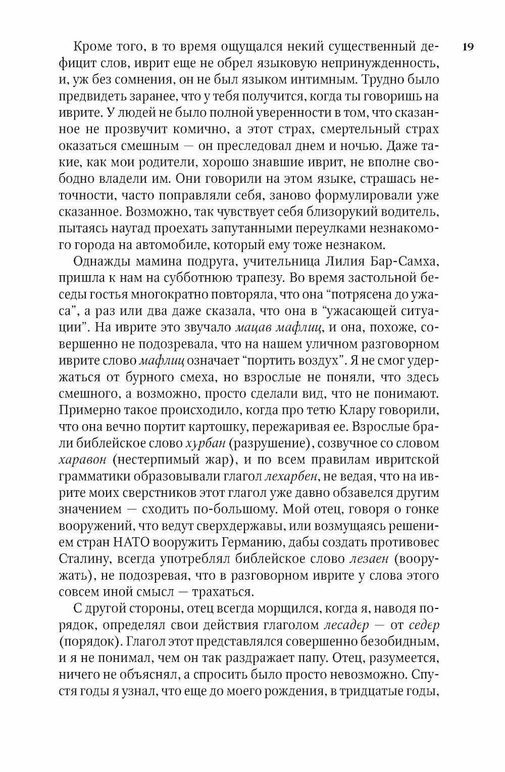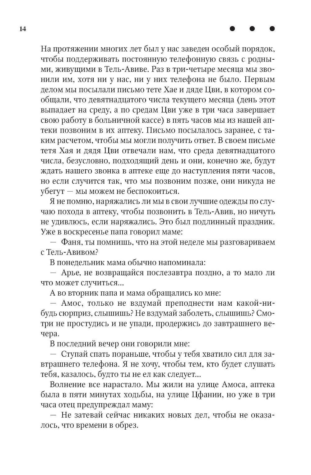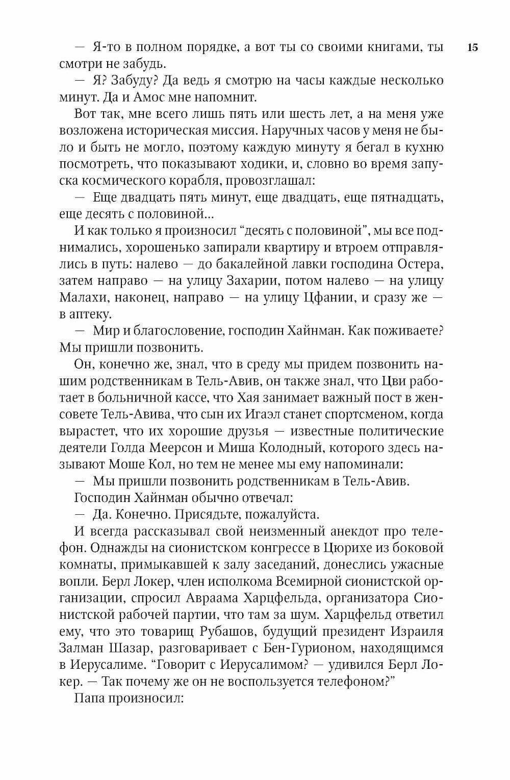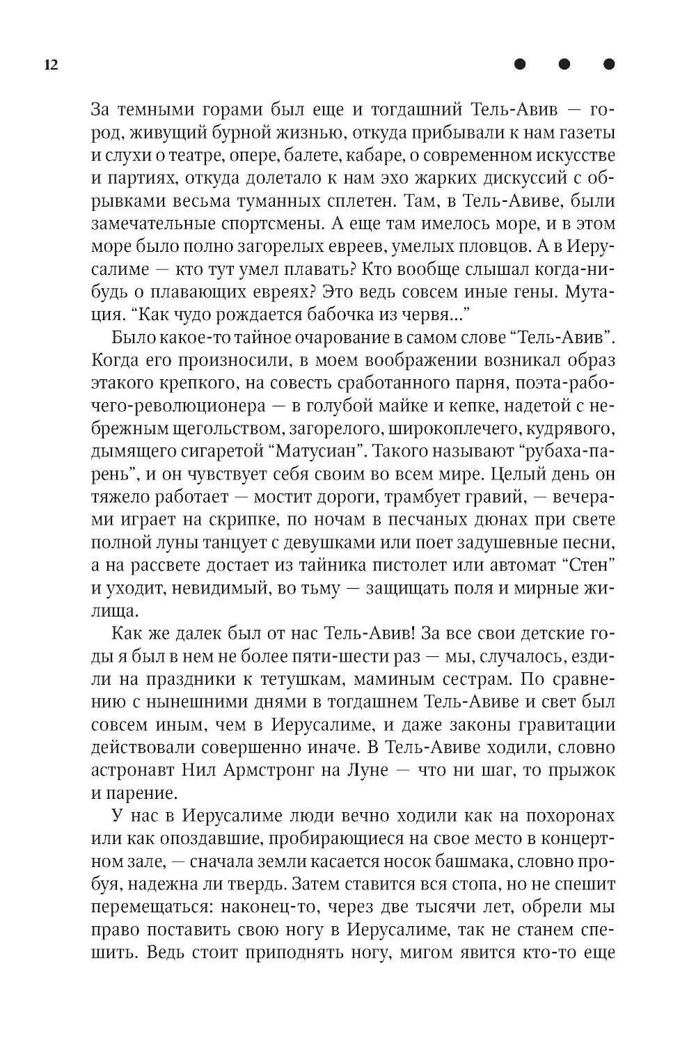 Роман-мемуар, самая личная книга классика израильской литературы. Семейная сага и автопортрет писателя, который был свидетелем рождения нации и бурной эпохи послевоенного времени. Это история взросления мальчика, который вырос в истерзанном войной Иерусалиме, в маленькой квартирке, забитой книгами на двенадцати языках, и которого окружали двенадцать родственников. Это история подростка, жизнь которого навсегда изменилась после смерти матери. Это история молодого человека, который сумел вырваться из удушливого мира семьи, влиться в неведомый новый мир, изменить свое имя. Это история известного писателя, который становится активным участником политической жизни своей страны.