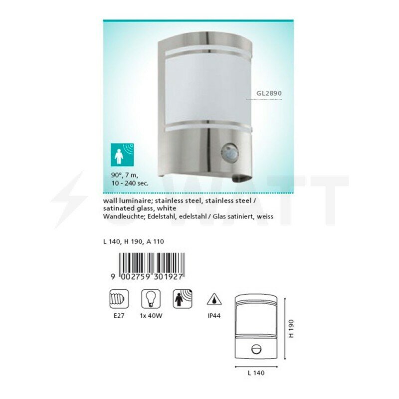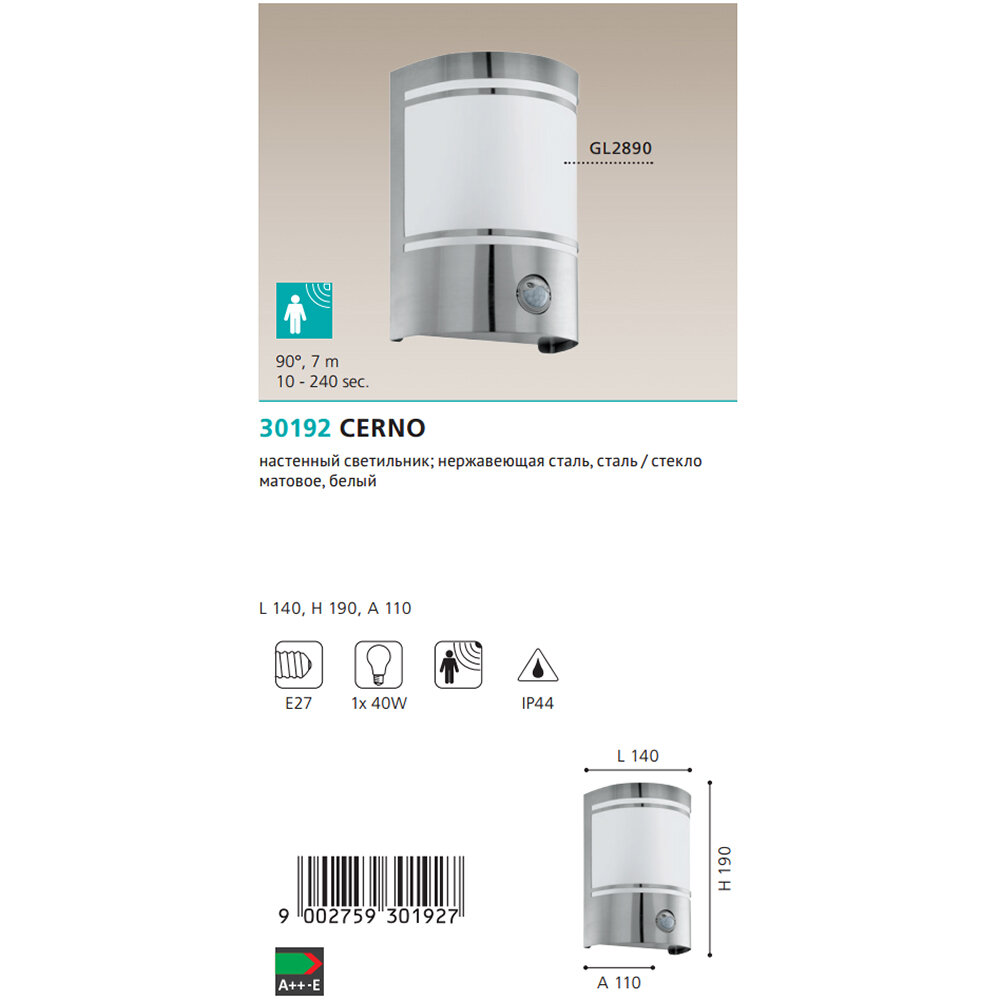 Архитектурная подсветка с датчиком движения Cerno - продукт известной компании Eglo (Австрия). Имеет максимальную мощность 40 Вт, освещает площадь до 2 кв. м. Отлично подойдет для таких мест, как сад, фасад. Впишется в интерьеры следующих стилей: модерн.