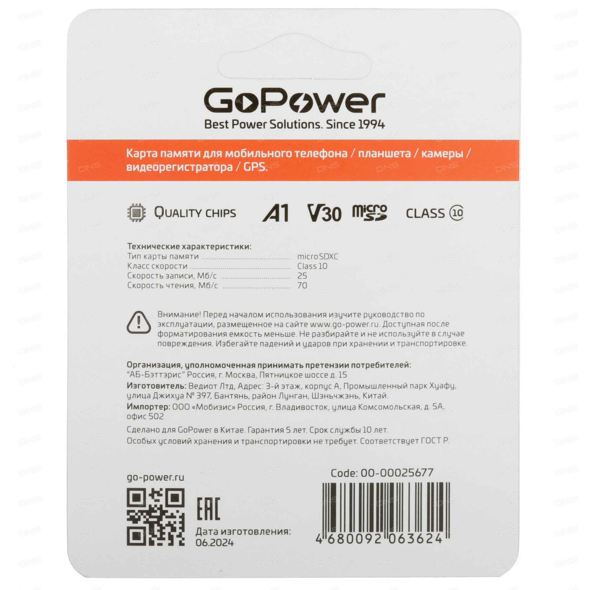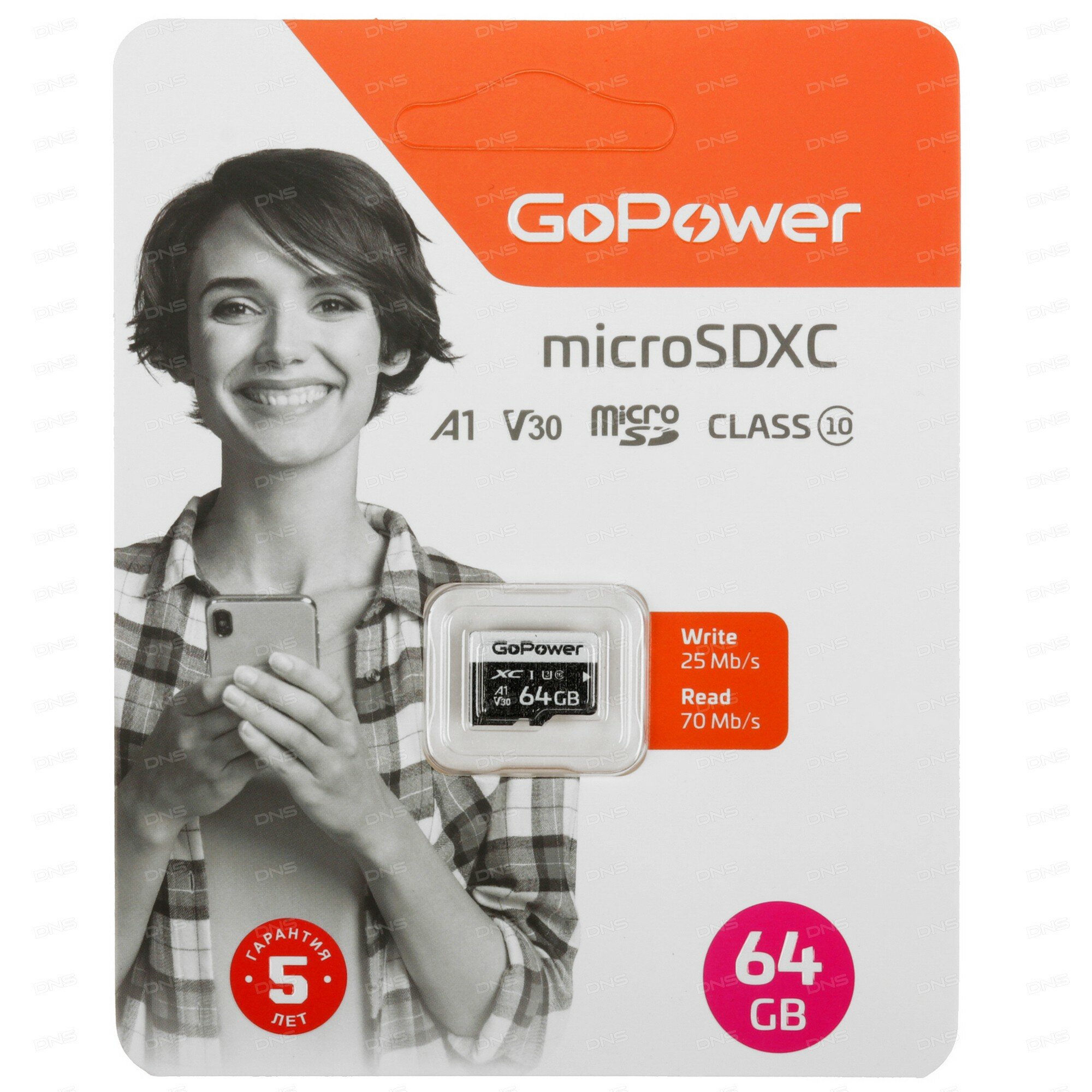 Карта памяти MicroSDXC 64GB GoPower Class10 70 МБ/сек V30 без адаптера 00-00025677
