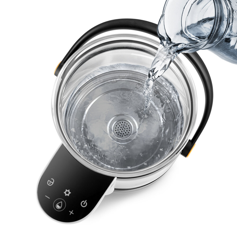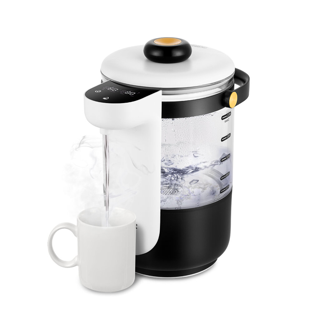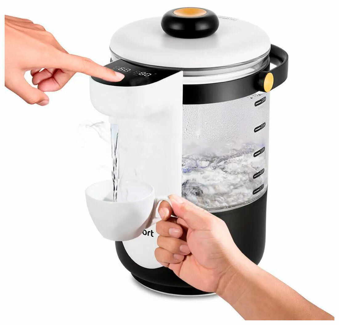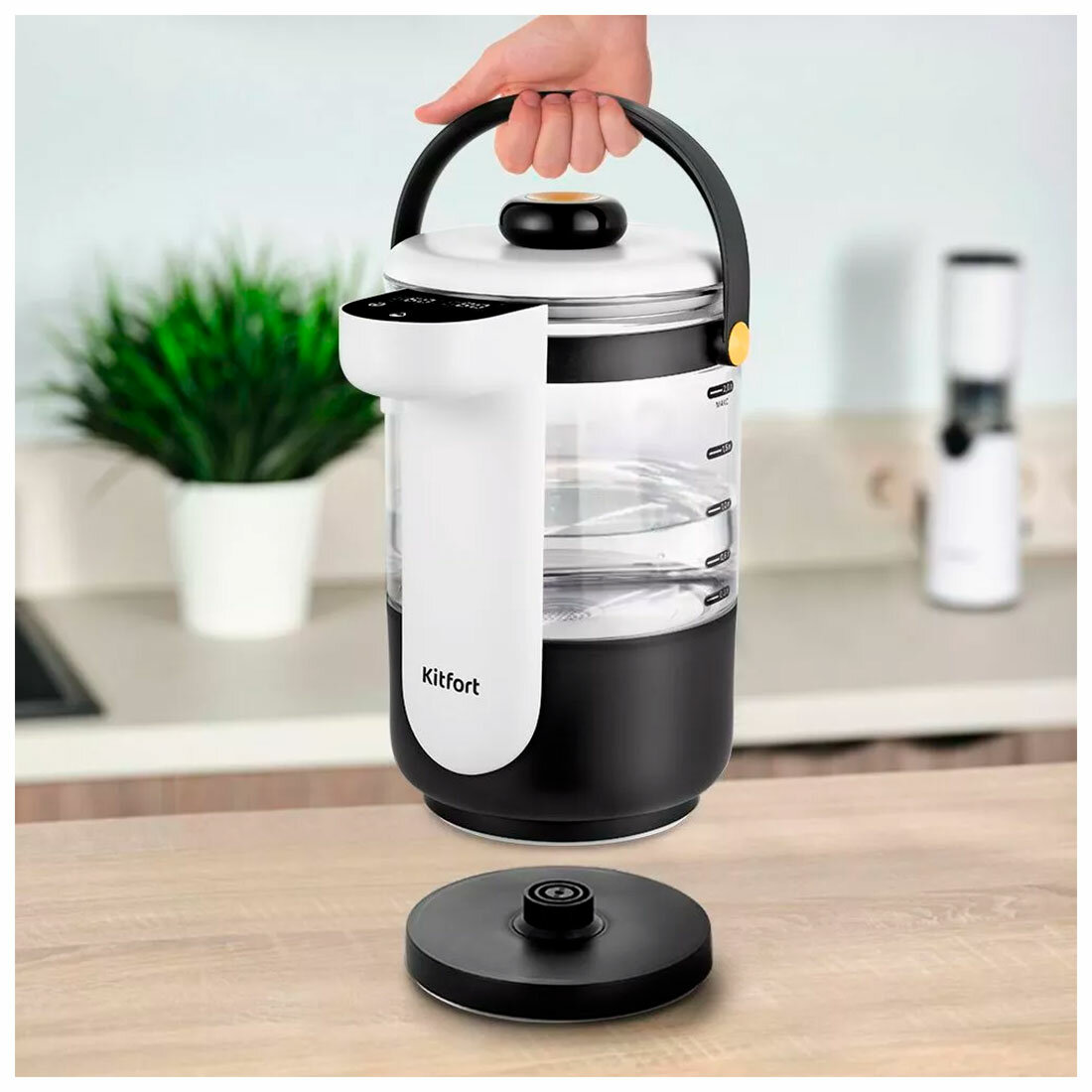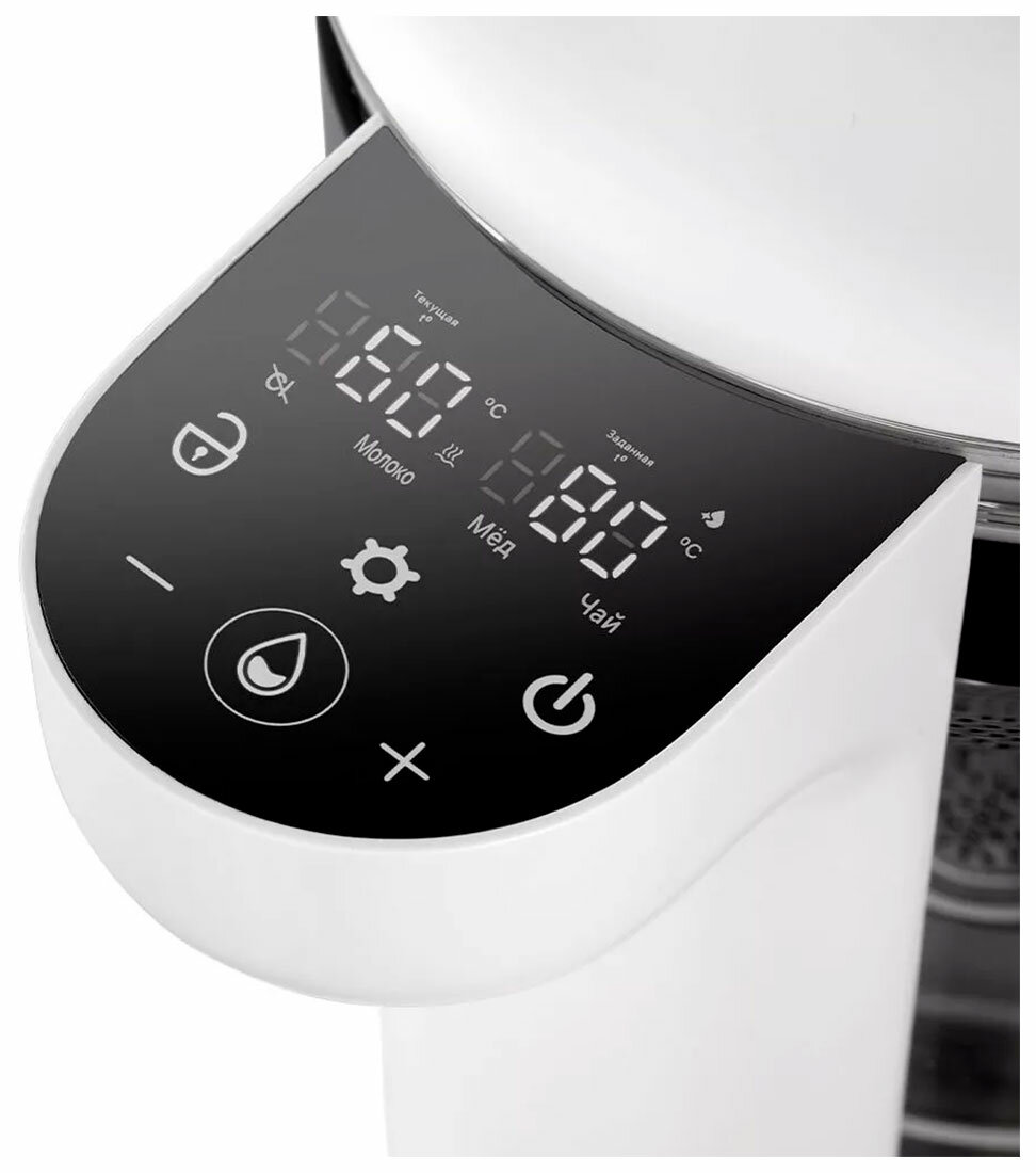 Kitfort КТ-2521 - решение для дома и дачи, которое совмещает в себе удобство чайника и практичность термопота. Он отлично нагревает, кипятит и поддерживает температуру воды с помощью периодического включения и отключения нагрева. На верхней части устройства находится панель управления с LED-дисплеем. Дисплей показывает текущую температуру воды, заданную температуру и режимы работы. Текущая температура воды всегда видна на дисплее, что делает использование очень удобным. Термопот может не только вскипятить воду, но и оснащен функцией выбора и поддержания температуры от 30 до 85 °С. Это очень удобно при заваривании различных сортов чая и детского питания. Колба Kitfort КТ-2521 выполнена из стекла, а внутренняя сторона крышки — из нержавеющей стали, благодаря чему вода не соприкасается ни с какими пластиковыми частями. А режим дехлорирования уменьшит содержание в воде хлора. Термопот оснащен удобной ручкой для переноски. Колба прозрачная, на нее нанесена мерная шкала, поэтому следить за количеством воды очень удобно. Подставка с центральным контактом дает возможность располагать на ней термопот в любом положении, обеспечивая вращение на 360°.