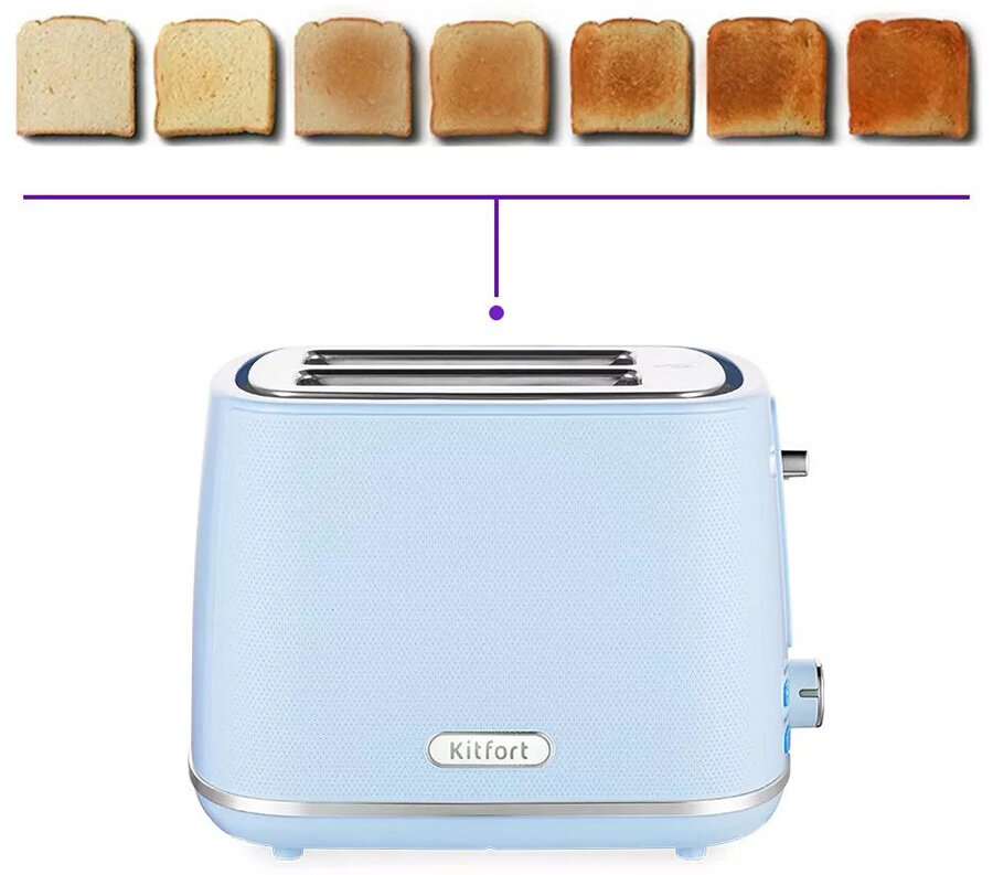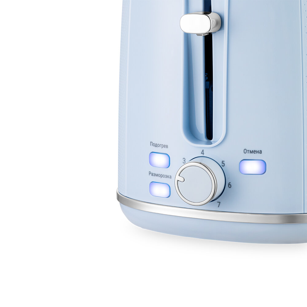 Тостер Kitfort КТ-6073 создан для любителей ароматного и хрустящего, поджаренного хлеба. Прибор позволяет быстро поджарить тосты для горячих бутербродов, сэндвичей, а также бейглы, хлебцы для закусок, салатов и других блюд. Тостер оснащён регулятором степени обжаривания. «Подогрев» служит для разогрева уже готовых тостов, если они остыли. «Разморозка» позволяет приготовить тосты из замороженного хлеба. «Отмена» - прибор выключается, а тосты поднимаются наверх. Загруженные тосты автоматически центрируются, чтобы их поджарка с двух сторон была равномерной независимо от толщины куска. После приготовления, устройство отключается, а тосты поднимаются вверх, чтобы их было удобнее извлекать, без риска обжечься. Благодаря 7 степеням обжаривания вы можете приготовить горячие тосты на любой вкус и из любых видов хлеба. Особый вкус и цвет тостов получаются такими благодаря карамелизации сахара, содержащегося в муке, в процессе приготовления. В нижней части корпуса тостера расположен съёмный поддон для сбора крошек. Просто выдвиньте его и выбросите скопившиеся крошки, а остатки протрите салфеткой. Тостер Kitfort КТ-6073 порадует вас не только приготовленными тостами, но и своим красивым дизайном – тостер выполнен в нежно-голубом цвете, он идеально впишется в интерьер вашей кухни. Вы можете приготовить сразу 1 или 2 тоста одновременно. На дне корпуса тостера имеется отсек для хранения шнура, в который можно смотать излишки шнура электропитания, чтобы он не мешал на столе.