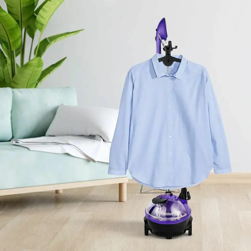 Отпариватель «3 в 1» КТ-9133 представляет собой многофункциональное устройство, сочетающее в себе функции отпаривателя, утюга и пароочистителя. Благодаря паровому утюжку можно быстро отпарить различные предметы из текстиля, а также выполнить сухую глажку. КТ-9133 имеет плавную регулировку подачи пара для различных типов тканей. Кнопка подачи пара и регулятор находятся и на корпусе прибора, и на паровом утюжке. Крышка разъёма парового шланга не допускает попадание пыли и грязи внутрь устройства. Принцип работы отпаривателя прост: вода из резервуара подается в бойлер с помощью помпы (водяного насоса). Пар проходит по паровому шлангу и выходит из паровых сопел на рабочей поверхности парового утюжка. В комплекте есть телескопическая стойка и складная вешалка. С их помощью можно отпаривать одежду в вертикальном положении. Фиксатор вешалки позволит вам закрепить вешалку на стойке. Ширину плечиков можно регулировать.