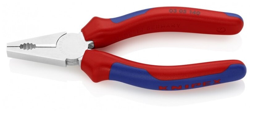 03 05 140 Плоскогубцы комбинированные с зонами захвата плоских и круглых деталей. с режущими кромками для мягкой и твердой проволоки. длинные режущие кромки для толстых кабелей. режущие кромки дополнительно закалены токами высокой частоты до твердости примерно 60 HRC. - Параметры резания /проволока средней твёрдости (диаметр): Ø 2,8mm - Параметры резания / твёрдая проволока (диаметр): Ø 1,8mm - Параметры режима резки: медный кабель, многопроводный: Ø 9,0mm - Параметры режима резки: медный кабель, многопроводный: 10,0mm²