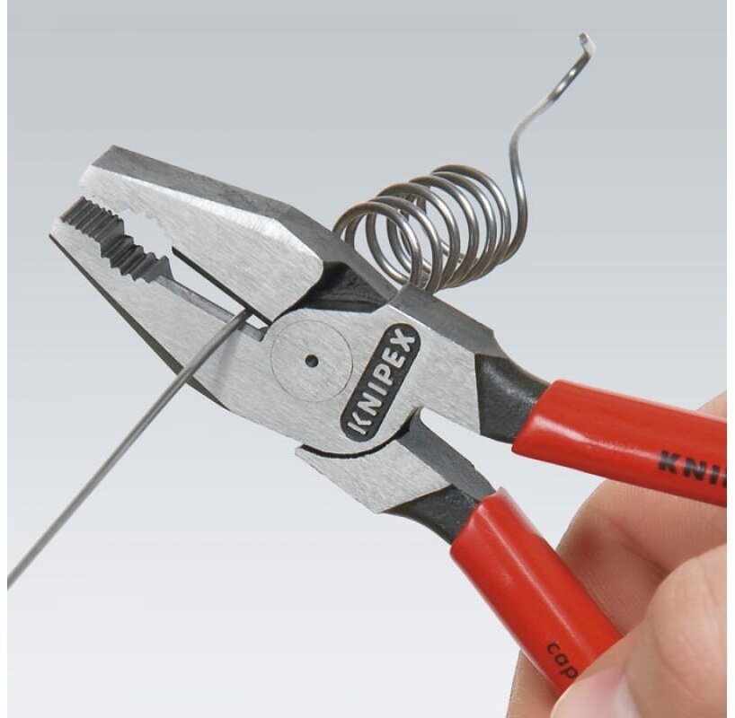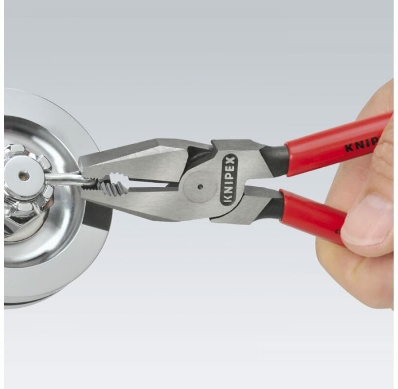 Силовые пассатижи KNIPEX - универсальный инструмент, включающий в себя функции бокорезов и плоскогубцев. Предназначены для захвата, изгибания и удержания деталей, а также резки проволоки и проводов. Инструмент выполнен из специальной инструментальной стали методом ковки с последующей закалкой, что придает ему дополнительную прочность и износостойкость. Пластмассовые чехлы на рукоятках исключают скольжение руки во время работы. Особенности: Удобство работы. Рукоятки инструмента снабжены специальными пластмассовыми чехлами для исключения скольжения и защиты рук оператора во время работы. Защита. Поверхность силовых пассатижей KNIPEX обработана воронением и отполирована, что обеспечивает надежную защиту от коррозии. Преимущества пассатижей Knipex : Длительный срок эксплуатации; Оптимизированное передаточное отношение и передача усилия способствуют уменьшению силы воздействия; Возможность работы с медными и алюминиевыми многожильными кабелями диаметром до 14 мм и площадью сечения до 25 мм², твердой проволокой диаметром до 3.0 мм и проволокой из пружинной стали диаметром до 2.5 мм; Захватные губки дополнительно закалены до твердости 63 HRC, что позволяет выдерживать высокие нагрузки.