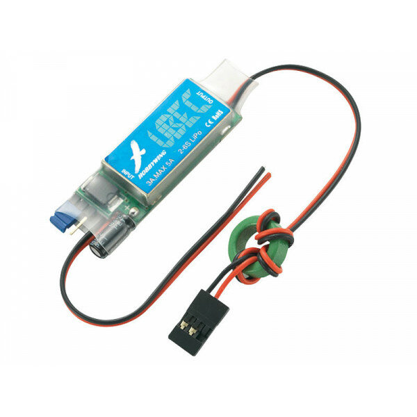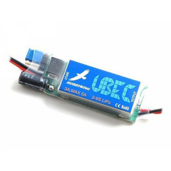 Импульсный регулятор напряжения HobbyWing HW-UBEC-3A (UBEC-3A-6S) понижает выходное напряжение силовой батареи 2-6S LiPo (5. 5-26V) до необходимого уровня 5V или 6V. Использование импульсного преобразователя необходимо в тех случаях, когда номинальное напряжение силовой батареи превышает 6В, а также в случае применения мощных и быстрых цифровых сервомашинок, потребляющих большие токи. Особенности: Напряжение 5V / 6V переключается джампером. Защита от переполюсовки. Металлическая крышка, защищающая микросхемы от наводок. Сигнализирует диодом о перегрузке. Импульсная схема имеет больший КПД, чем линейная. Идеально для питания гироскопов, мощных сервомашинок, большого количества подсветки. Спецификация: размеры: 43 х 17 х 7 мм; входное напряжение: 5. 5-26V; выходное напряжение: 5/6V; рабочий ток: 3А; пиковый ток: 5А; поддерживаемые аккумуляторы: 2-5S LiPo; вес: 11 г. В комплекте: один импульсный регулятор напряжения HobbyWing HW-UBEC-3A