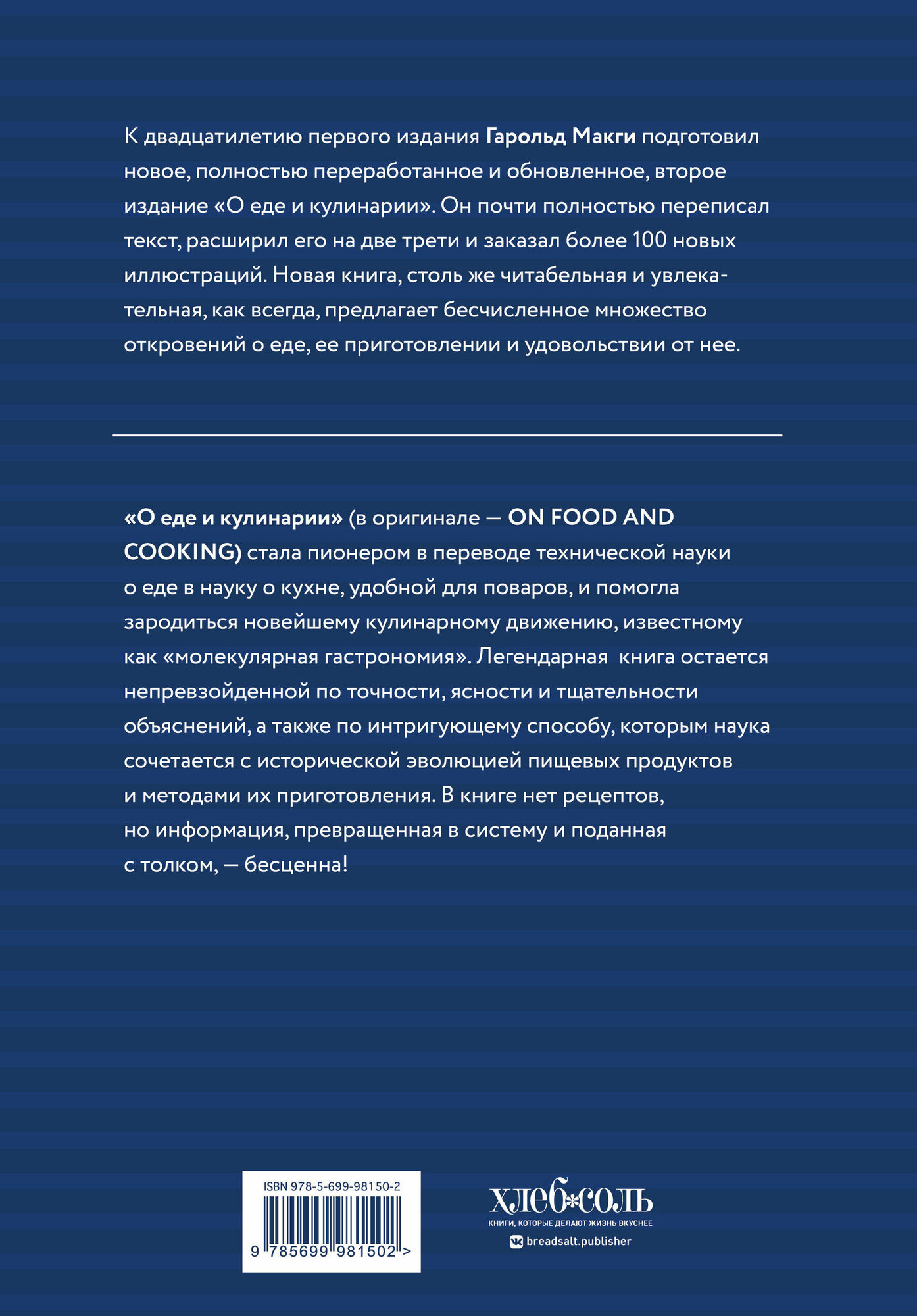 Книга «О еде и кулинарии» стала пионером в том, чтобы подружить научную и кулинарную сторону продуктов и процессов приготовления, и помогла зародиться кулинарному движению, известному как «молекулярная гастрономия». Хотя о кулинарии были написаны другие книги, книга Гарольда Макги остается непревзойденной по точности, ясности и тщательности объяснений, а также по интригующему способу, которым наука сочетается с исторической эволюцией пищевых продуктов и методов приготовления.