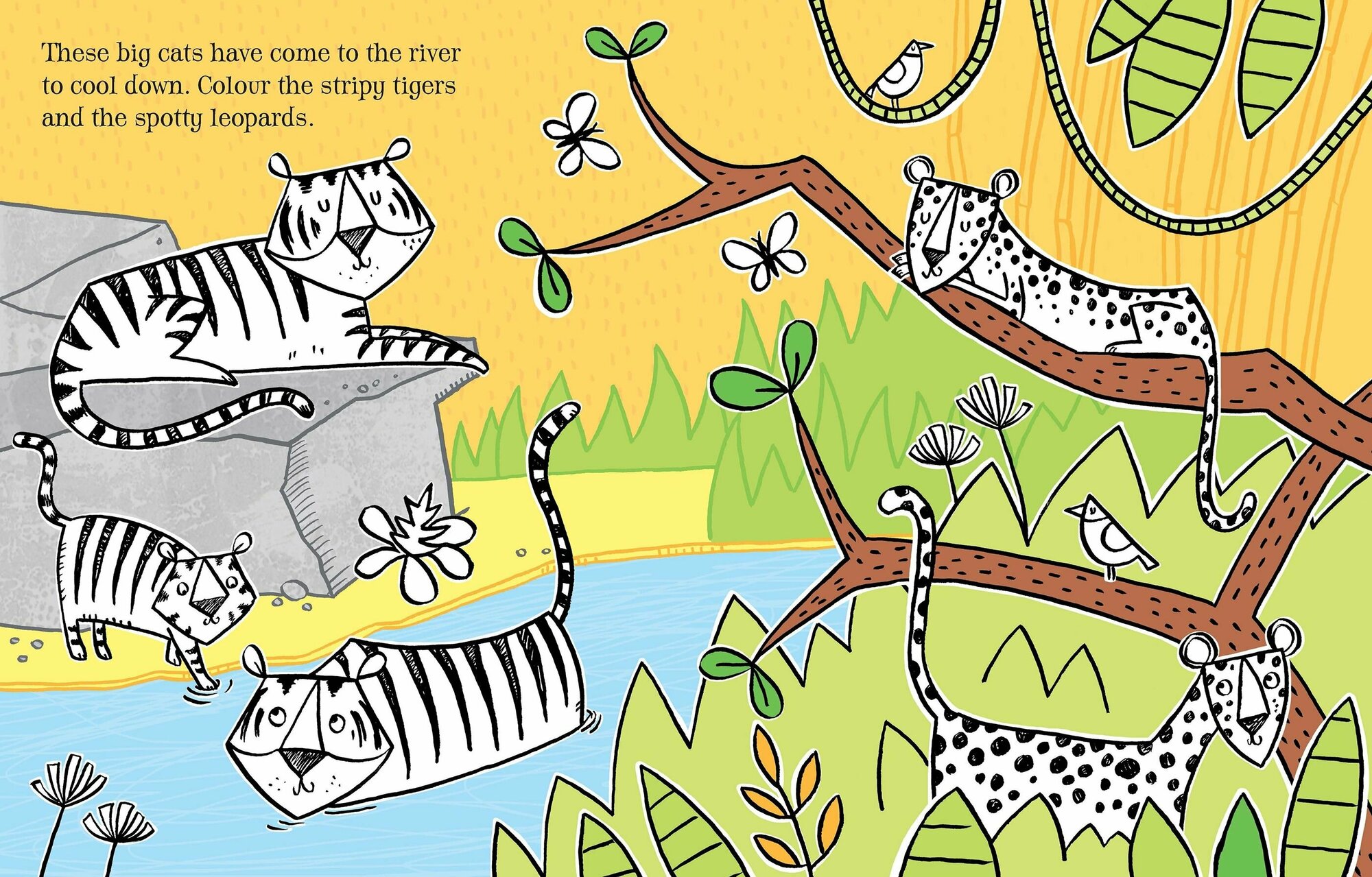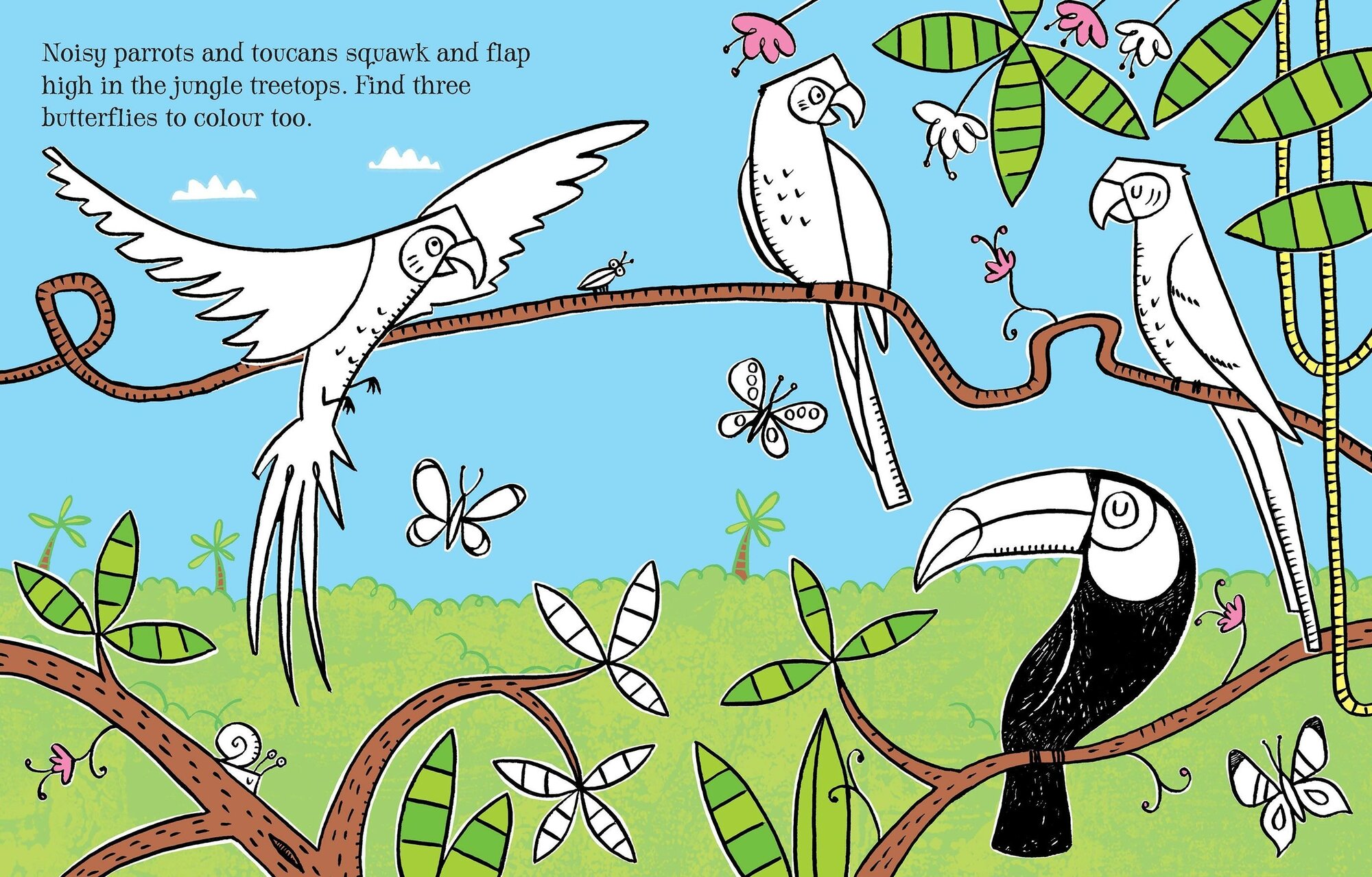 Bring the jungle to life by colouring in monkeys, tigers, elephants and lots of other amazing rainforest animals in this exciting colouring book. Scenes include birds squawking in the treetops, big cats cooling down by the river and elephants getting ready for bedtime. The backgrounds are already coloured in, so children can focus on the fun parts.