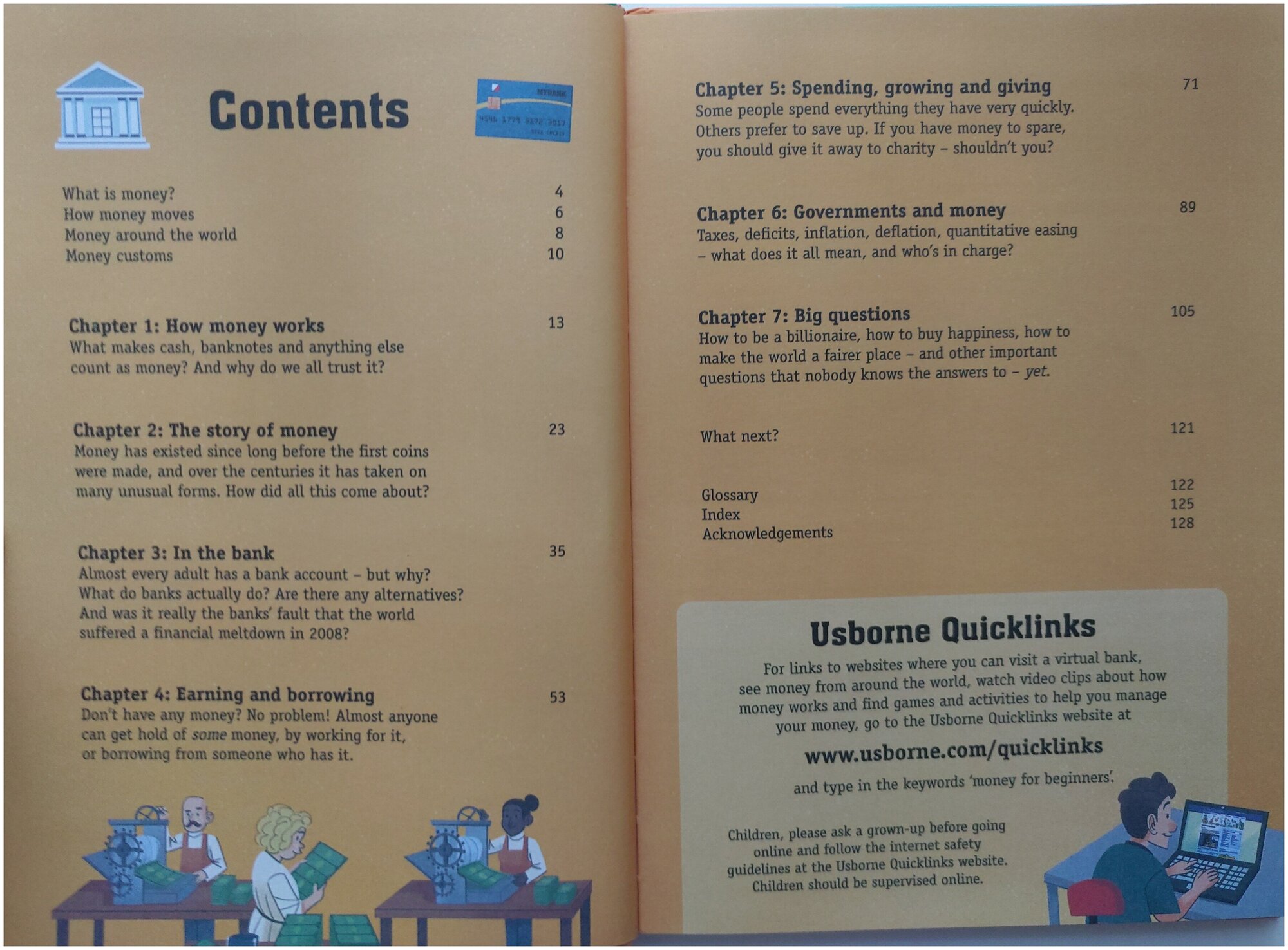 An informative introduction to the world of money, covering everything from bank accounts, earning and borrowing to government spending, taxes and inflation. With bright, infographic pictures, a detailed glossary and links to specially selected websites where you can visit a virtual bank, see money from around the world and more.
