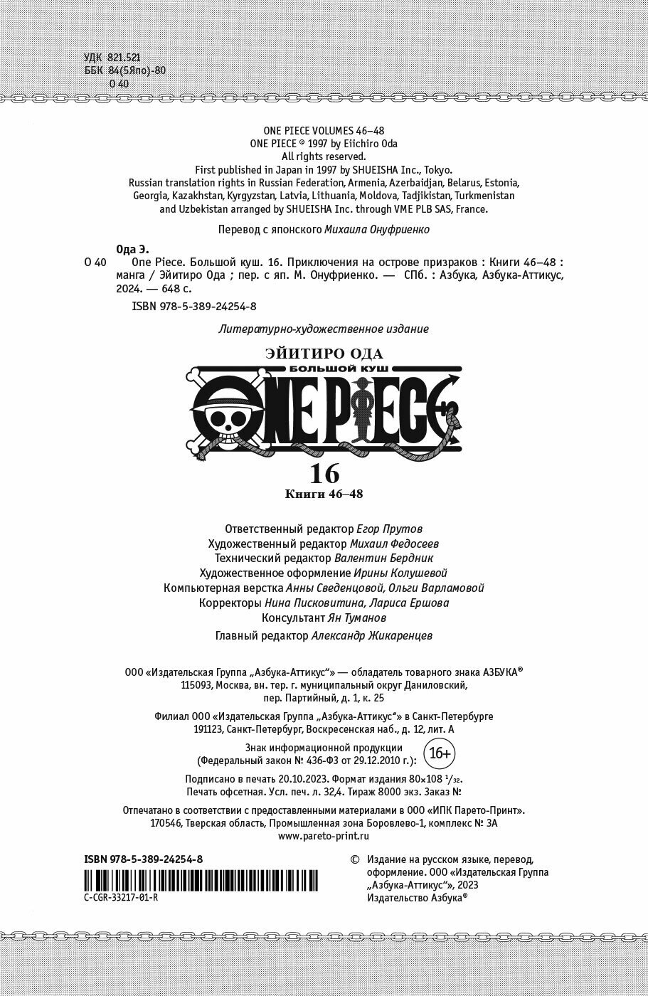 One Piece. Большой куш. Книга 16. Приключения на острове призраков (Эйитиро Ода); Азбука, 2023